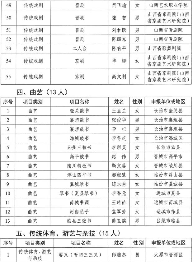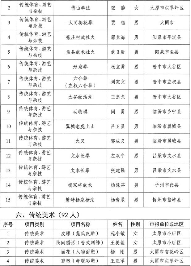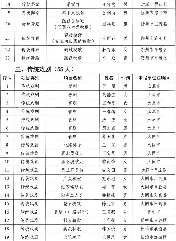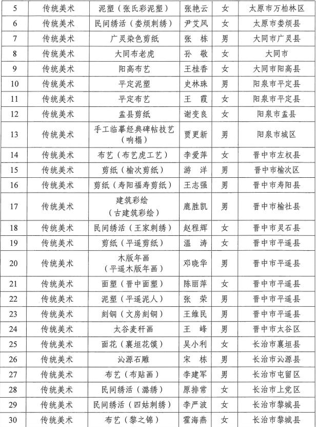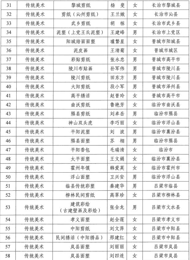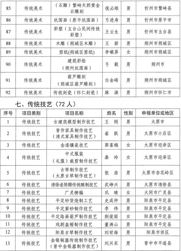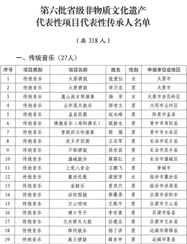 進(jìn)入第六批省級(jí)非物質(zhì)文化遺產(chǎn)代表性項(xiàng)目代表性傳承人名單的傳承人共318名,其中,傳統(tǒng)音樂(lè)類包括太原鑼鼓張愛(ài)仙、上黨八音會(huì)衛(wèi)鵬飛等27人,傳統(tǒng)舞蹈類包括渾源耍故事郭青松、左權(quán)小花戲韓永青等23人,傳統(tǒng)戲劇類包括晉劇閆耀、靈丘羅羅腔安文國(guó)等55人,曲藝類包括壺關(guān)鼓書(shū)王里蘭、陵川鋼板書(shū)靳文蓮等13人,傳統(tǒng)體育、游藝與雜技類包括大同梅花拳賈鈺、文水長(zhǎng)拳左雙牛等15人,傳統(tǒng)美術(shù)類包括廣靈染色剪紙張棟。平遙木版年畫(huà)鄧曉華等92人,傳統(tǒng)技藝類包括晉作家具制作技藝崔躍、平定紫砂制作技藝?yán)顐サ?2人,傳統(tǒng)醫(yī)藥類包括太原楊氏形意正骨術(shù)楊中江、大同泉派中醫(yī)療法李亮等21人。