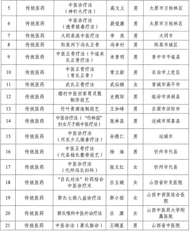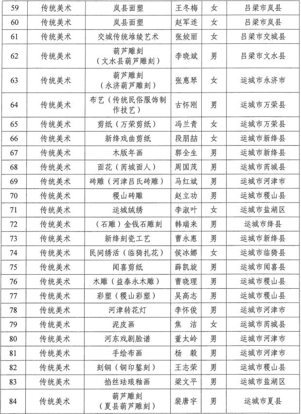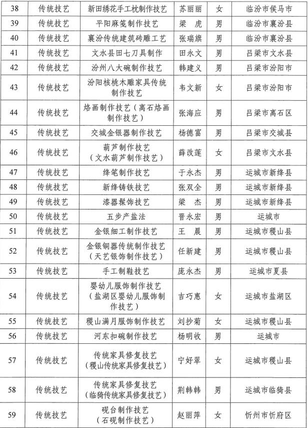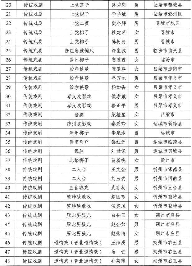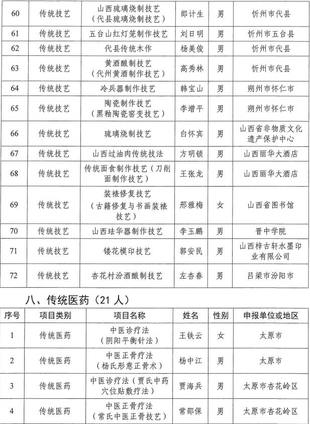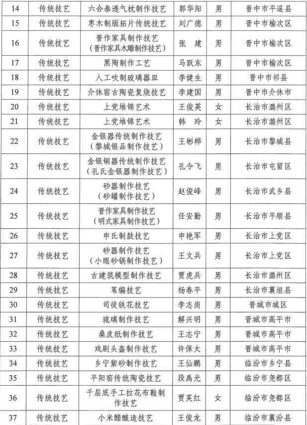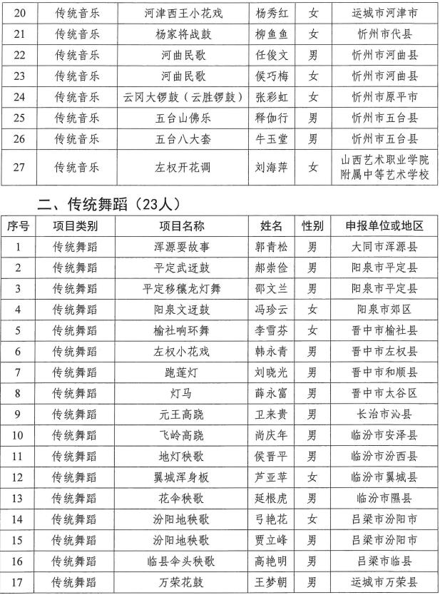 進(jìn)入第六批省級(jí)非物質(zhì)文化遺產(chǎn)代表性項(xiàng)目代表性傳承人名單的傳承人共318名,其中,傳統(tǒng)音樂(lè)類包括太原鑼鼓張愛(ài)仙、上黨八音會(huì)衛(wèi)鵬飛等27人,傳統(tǒng)舞蹈類包括渾源耍故事郭青松、左權(quán)小花戲韓永青等23人,傳統(tǒng)戲劇類包括晉劇閆耀、靈丘羅羅腔安文國(guó)等55人,曲藝類包括壺關(guān)鼓書(shū)王里蘭、陵川鋼板書(shū)靳文蓮等13人,傳統(tǒng)體育、游藝與雜技類包括大同梅花拳賈鈺、文水長(zhǎng)拳左雙牛等15人,傳統(tǒng)美術(shù)類包括廣靈染色剪紙張棟。平遙木版年畫(huà)鄧曉華等92人,傳統(tǒng)技藝類包括晉作家具制作技藝崔躍、平定紫砂制作技藝?yán)顐サ?2人,傳統(tǒng)醫(yī)藥類包括太原楊氏形意正骨術(shù)楊中江、大同泉派中醫(yī)療法李亮等21人。