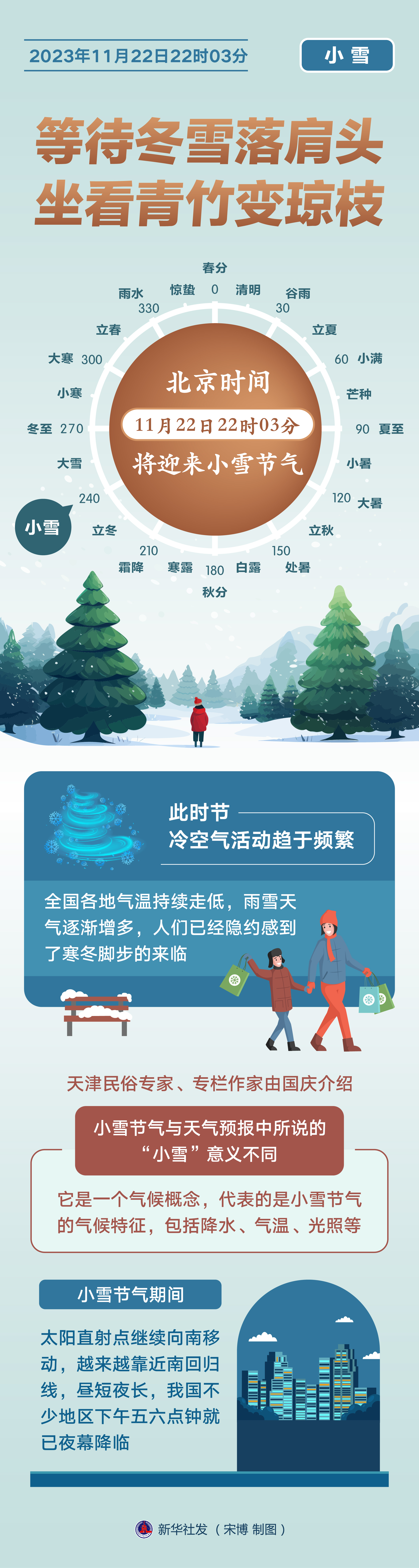 天津民俗專家、專欄作家由國慶介紹,小雪節(jié)氣與天氣預(yù)報(bào)中所說的“小雪”意義不同,它是一個(gè)氣候概念,代表的是小雪節(jié)氣的氣候特征,包括降水、氣溫、光照等。小雪節(jié)氣期間,太陽直射點(diǎn)繼續(xù)向南移動(dòng),越來越靠近南回歸線,晝短夜長,我國不少地區(qū)下午五六點(diǎn)鐘就已夜幕降臨。