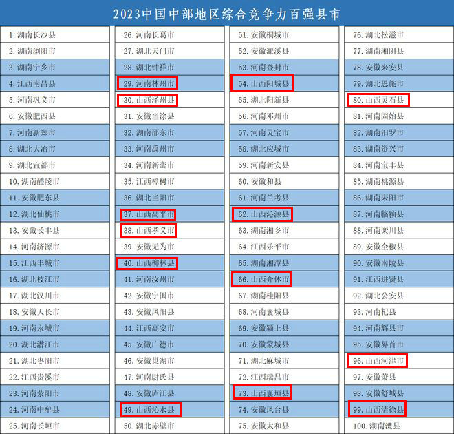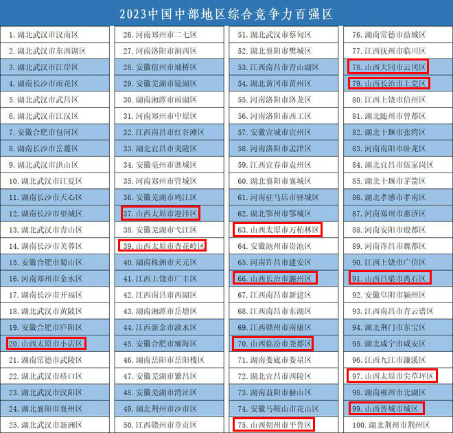 近日,競爭力智庫等機構在北京發(fā)布《中國縣域發(fā)展監(jiān)測報告2023》,揭曉“2023中國綜合競爭力百強縣市”等名單,太原市清徐縣入圍“2023中國中部地區(qū)綜合競爭力百強縣市”,太原市小店區(qū)、迎澤區(qū)、杏花嶺區(qū)、萬柏林區(qū)、尖草坪區(qū)入圍“2023中國中部地區(qū)綜合競爭力百強區(qū)”。