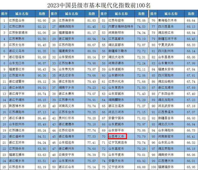 《報告》顯示,2023中國縣級市基本現(xiàn)代化指數(shù)前100名中,江蘇昆山市、江陰市、張家港市位列前三。分區(qū)域看,前100名中,東部地區(qū)66個、中部地區(qū)20個、西部地區(qū)12個、東北地區(qū)2個,其中,中部地區(qū)數(shù)量增加3個,在四大區(qū)域中席次增加最多。分省看,江蘇和浙江數(shù)量最多,均為19個,山東18個。中國縣級市基本現(xiàn)代化指數(shù)前100名常住人口平均為89.09萬人、城鎮(zhèn)化率平均為66.1%,地區(qū)生產(chǎn)總值平均為1106億元,一般公共預(yù)算收入平均為72億元,社會消費(fèi)品零售總額平均為346億元;人均地區(qū)生產(chǎn)總值平均為125649元,城鎮(zhèn)居民人均可支配收入平均為55260元,農(nóng)村居民人均可支配收入平均為31317元,城鄉(xiāng)居民人均可支配收入比平均為1.78;公共圖書館總藏書量平均為95萬冊;空氣質(zhì)量優(yōu)良率平均為85.4%,人均公園綠地面積平均為15.59平方米,地表水水質(zhì)達(dá)到或好于Ⅲ類水體比例平均為98.5%。