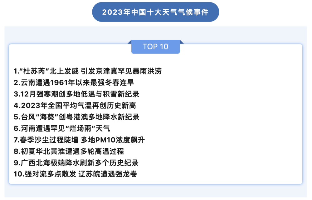 近年來,“XX年一遇”的高溫、暴雨、寒潮似乎頻繁了不少,“極端天氣”這個(gè)曾經(jīng)略顯生僻的氣象專業(yè)名詞也逐漸被公眾熟知。國家氣候中心1月19日發(fā)布2023年國內(nèi)十大天氣氣候事件,臺(tái)風(fēng)“杜蘇芮”北上引發(fā)京津冀罕見暴雨洪澇、春季沙塵過程陡增、遼蘇皖遭遇強(qiáng)龍卷等讓大家印象深刻的極端天氣均在列。