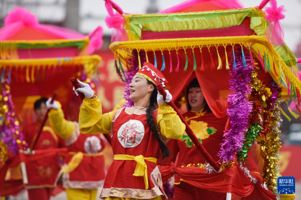 2月23日,在山西省臨汾市曲沃縣晉園公園內(nèi),社火隊(duì)員在表演抬花轎。