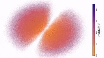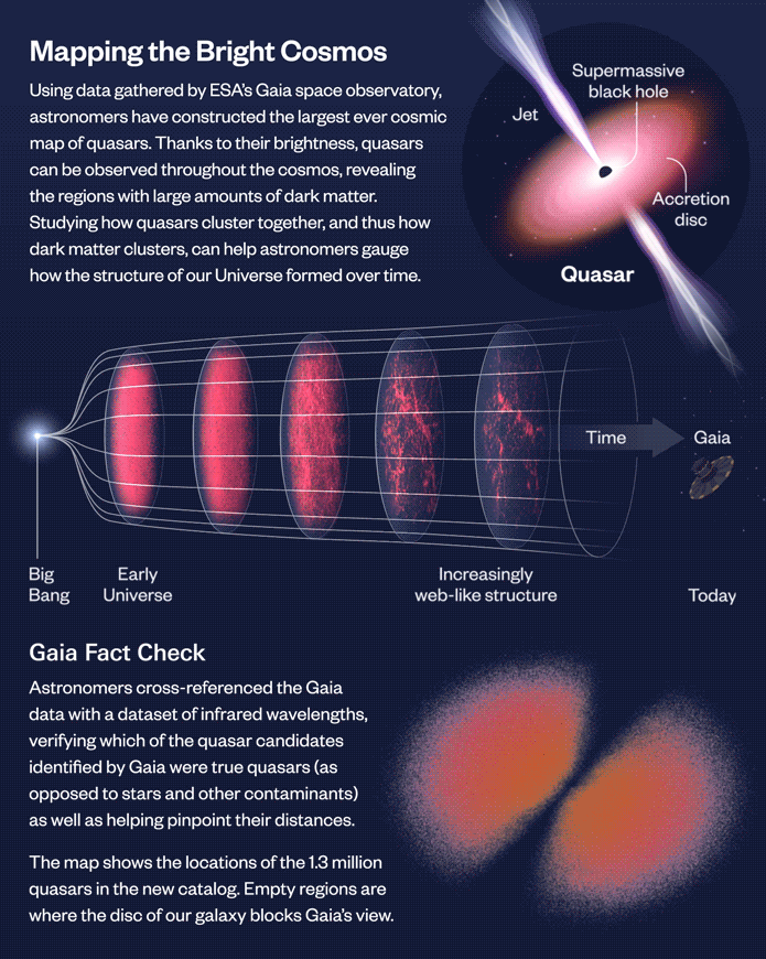 這張地圖使用了來自蓋亞第三次數(shù)據(jù)發(fā)布的數(shù)據(jù),其中包含 660 萬個候選類星體,以及來自 NASA 廣域紅外巡天探測器 (WISE) 和斯隆數(shù)字巡天 (SDSS) 的數(shù)據(jù)(合并數(shù)據(jù)有助于剔除蓋亞原始數(shù)據(jù)集的污染物,并更好地確定與類星體的距離)。