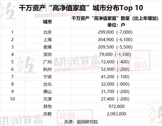 廣東地區(qū)今年成為最多千萬資產(chǎn)“高凈值家庭”的地區(qū),比上年減少8,000戶至30萬戶,減少2.2%,其中擁有千萬可投資資產(chǎn)的“高凈值家庭”數(shù)量有16.9萬戶;北京第二,比上年減少7,000戶,達(dá)到29.9萬戶,減少2.3%,其中擁有千萬可投資資產(chǎn)的“高凈值家庭”數(shù)量有15.2萬戶;上海第三,千萬資產(chǎn)“高凈值家庭”比上年減少6,100戶至26.5萬戶,減少2.3%,其中擁有千萬可投資資產(chǎn)的“高凈值家庭”數(shù)量有14.7萬戶;浙江第四,千萬資產(chǎn)“高凈值家庭”比上年減少1,200戶,達(dá)到21.5萬戶,減少0.6%,其中擁有千萬可投資資產(chǎn)的“高凈值家庭”數(shù)量有10.7萬戶;香港第五,千萬資產(chǎn)“高凈值家庭”比上年減少5,500戶,達(dá)到21萬戶,減少2.6%,其中擁有千萬可投資資產(chǎn)的“高凈值家庭”數(shù)量有10.7萬戶。