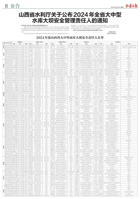 根據(jù)《水庫大壩安全管理?xiàng)l例》,按照省政府辦公廳《關(guān)于加強(qiáng)水庫安全管理工作的意見》(晉政辦發(fā)〔2023〕59號(hào))和水利部辦公廳《關(guān)于落實(shí)2024年水庫大壩安全責(zé)任人的通知》(辦運(yùn)管函〔2024〕52號(hào))要求,現(xiàn)將2024年度全省83座大中型水庫大壩安全責(zé)任人名單予以公布。