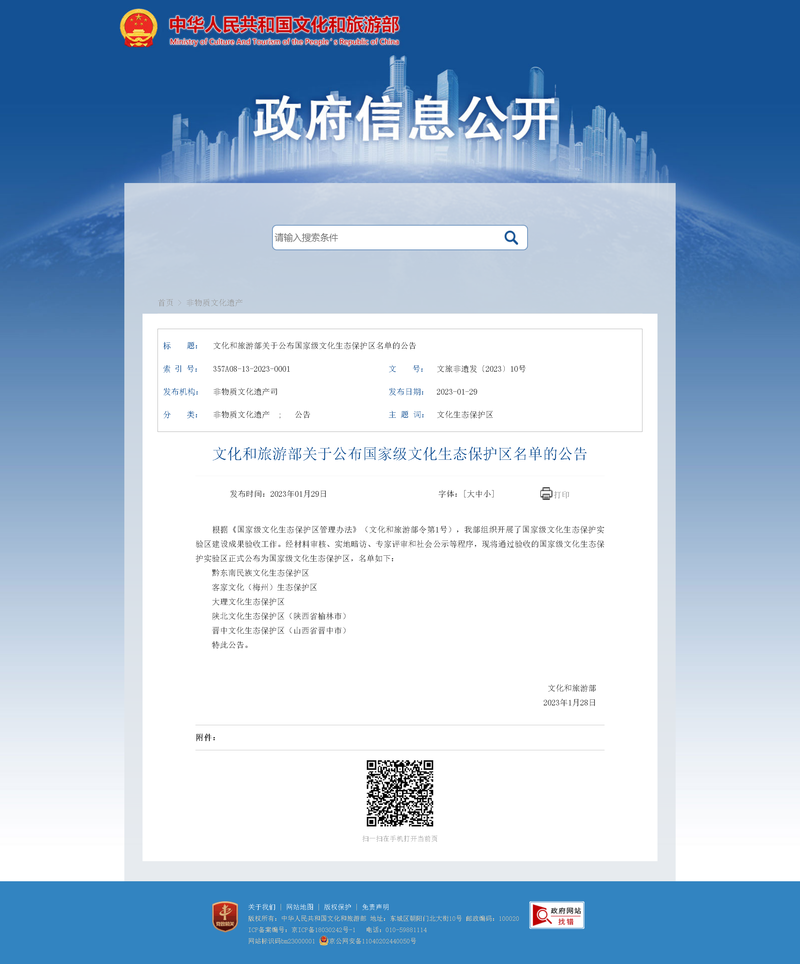 經(jīng)材料審核、實地暗訪、專家評審和社會公示等程序,文化和旅游部將通過驗收的國家級文化生態(tài)保護實驗區(qū)正式公布為國家級文化生態(tài)保護區(qū),它們是:黔東南民族文化生態(tài)保護區(qū)、客家文化(梅州)生態(tài)保護區(qū)、大理文化生態(tài)保護區(qū)、陜北文化生態(tài)保護區(qū)(陜西省榆林市)、晉中文化生態(tài)保護區(qū)(山西省晉中市)。