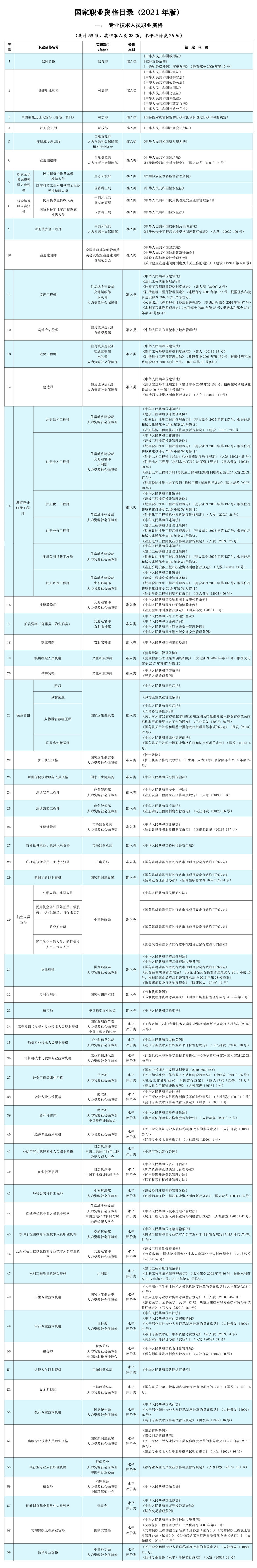 根據國務院推進簡政放權、放管結合、優(yōu)化服務改革要求,人力資源社會保障部會同國務院有關部門對《國家職業(yè)資格目錄》進行優(yōu)化調整,形成了《國家職業(yè)資格目錄(2021年版)》,經國務院同意,現(xiàn)予以公布。