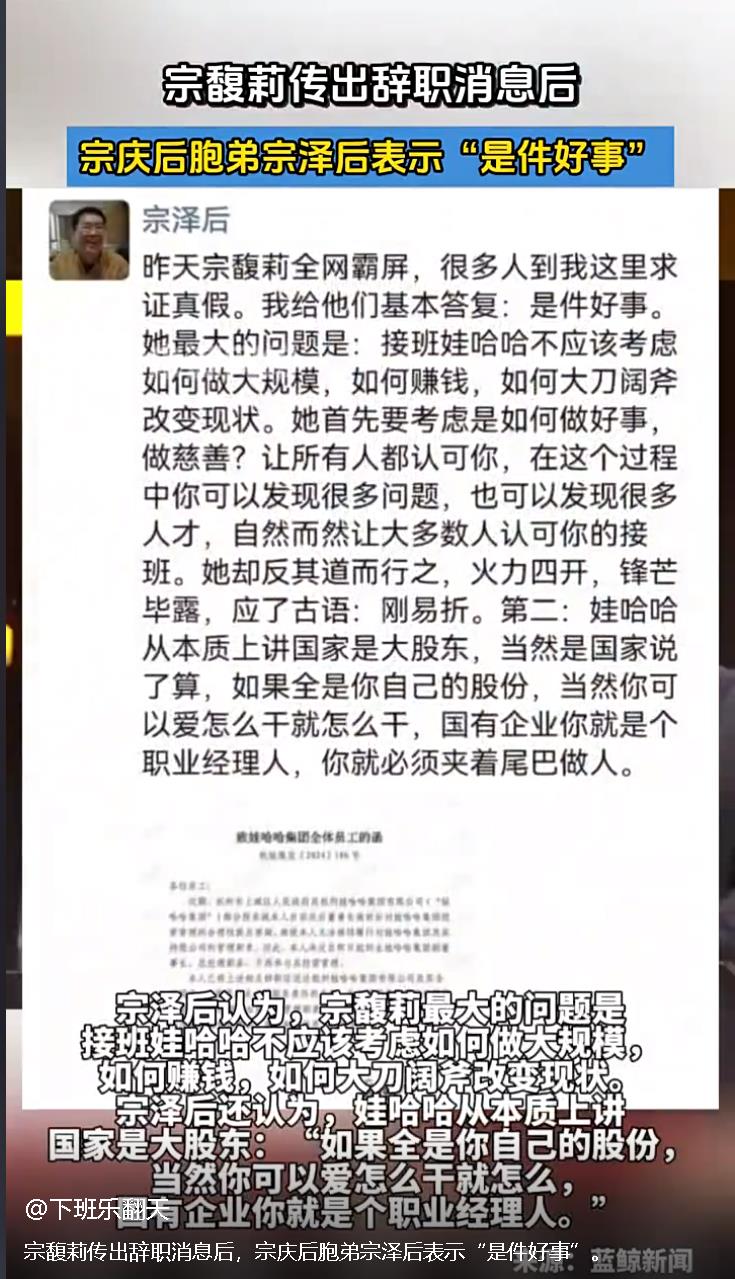 這或許一定程度上解釋了,宗慶后胞弟宗澤后為何會在朋友圈公開表示,宗馥莉辭職“是件好事”。