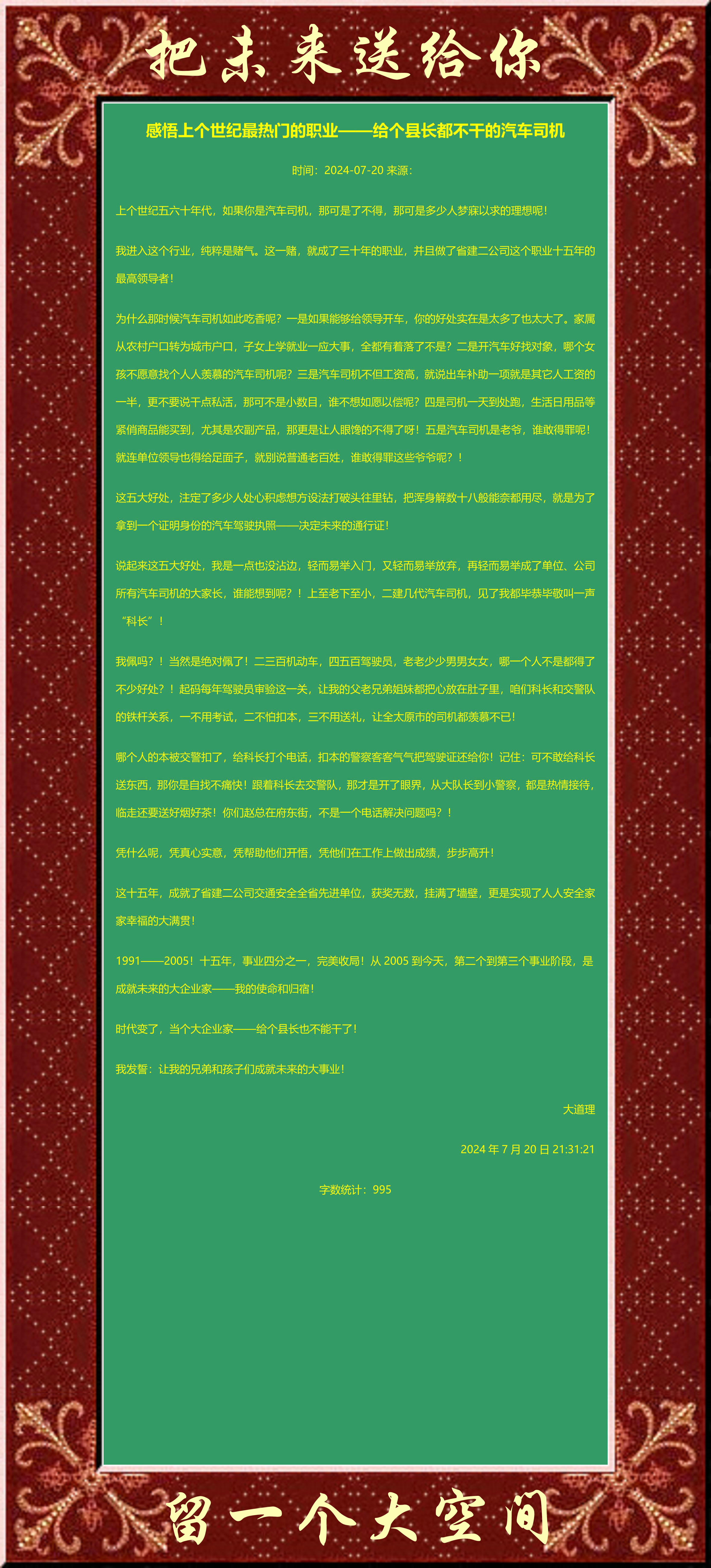 說起來這五大好處,我是一點(diǎn)也沒沾邊,輕而易舉入門,又輕而易舉放棄,再輕而易舉成了單位、公司所有汽車司機(jī)的大家長,誰能想到呢?!上至老下至小,二建幾代汽車司機(jī),見了我都畢恭畢敬叫一聲“科長”!