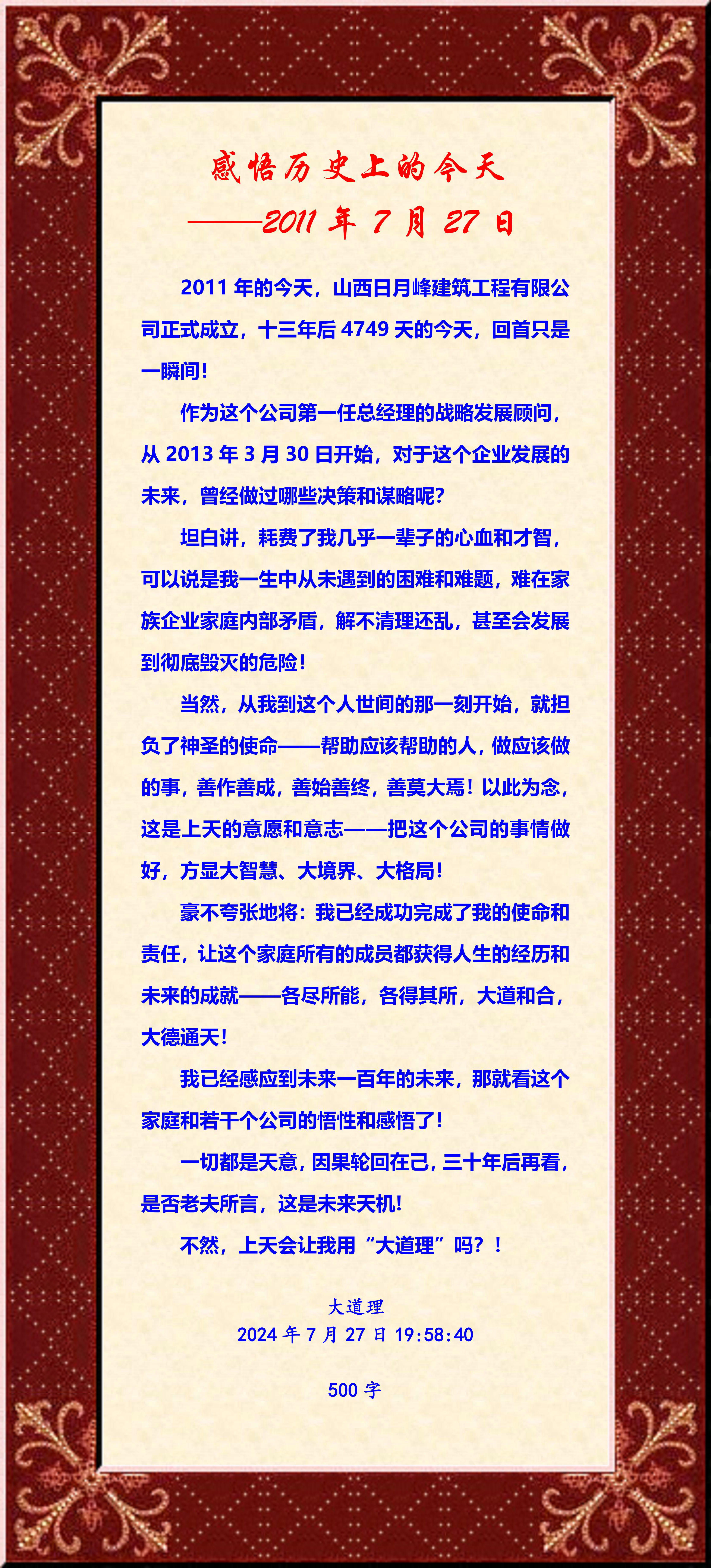 2011年的今天,山西日月峰建筑工程有限公司正式成立,十三年后4749天的今天,回首只是一瞬間!