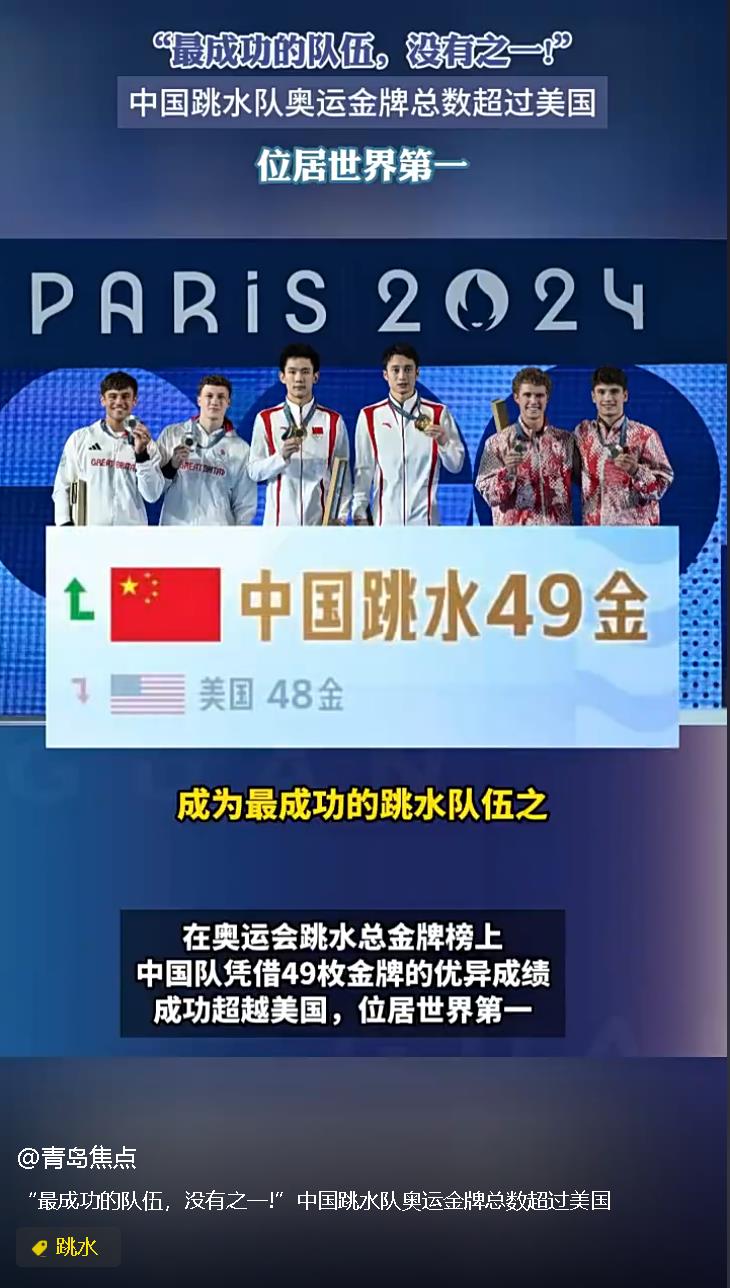 [中國跳水奧運金牌總數(shù)已超美國 轉(zhuǎn)發(fā)!為中國健兒發(fā)條微博!] 今天,在奧運會跳水總金牌榜上,中國跳水隊已獲49枚金牌,正式超越美國隊的48枚金牌。贊中國隊!
