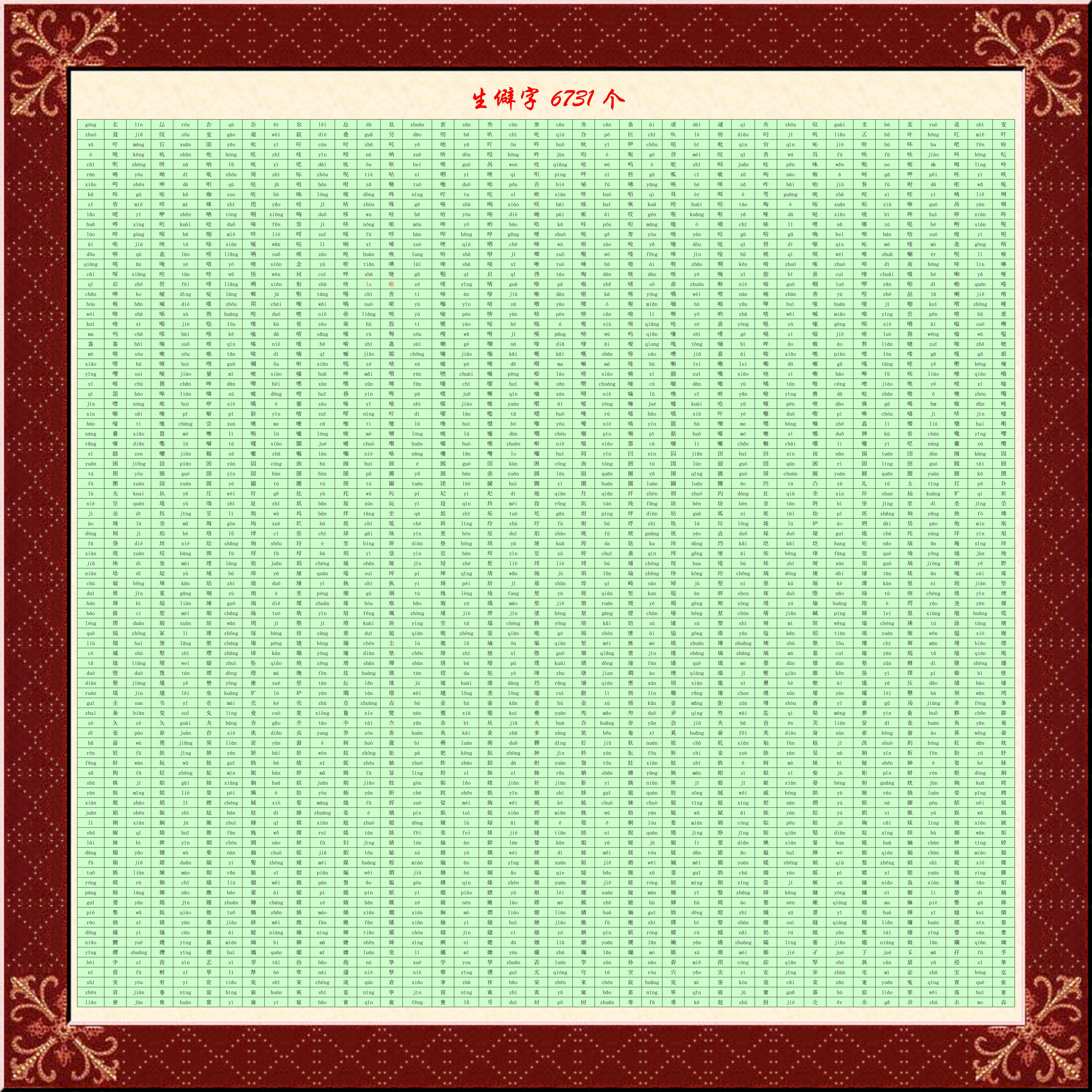 1. 爩 yù2. 灪 yù3. 爨 cuàn4. 爧 líng5. 囖 lo6. 欟 guang7. 灨 gàn8. 灧 yàn9. 灥 xún10. 犫 chōu11. 灎 yàn12. 灦 xiǎn13. 圞 luán14. 氎 dié15. 欜 náng16. 斸 zhǔ17. 灢 nǎng18. 爥 zhú19. 爦 lǎn20. 戇 gàng21. 戅 gàng22. 犪 kuí23. 曯 zhú24. 囔 nāng25. 欚 lǐ26. 欘 zhú27. 欝 yù28. 欙 léi29. 欛 bà30. 攮 nǎng31. 孎 zhú32. 灟 zhú33. 灞 bà34. 灠 lǎn35. 爣 tǎng36. 爤 làn37. 斖 wěi38. 巙 kuí39. 囕 lǎn40. 曭 tǎng41. 欔 jué42. 欓 dǎng43. 欗 lán44. 攭 lì45. 囍 xǐ46. 囍 xǐ47. 孏 lǎn48. 彏 jué49. 戄 jué50. 戃 tǎng51. 灜 ying52. 灚 jiǎo53. 灛 chǎn54. 灙 dǎng55. 灡 lán56. 爢 mí57. 灓 luán58. 曫 luán59. 玃 jué60. 巚 yǎn61. 巘 yǎn62. 囐 zá63. 壨 léi64. 曪 luǒ65. 曮 yǎn66. 囒 lán67. 奲 duǒ68. 欑 cuán69. 欕 yan70. 欐 lì71. 戁 nǎn72. 囏 jiān73. 毊 xiāo74. 攨 wā75. 攥 zuàn76. 攫 jué77. 攩 dǎng78. 孊 mǐ79. 孊 mǐ80. 孍 yán81. 孋 lí82. 戂 mí83. 灖 mǐ84. 灒 zàn85. 灗 shàn86. 爞 chóng87. 爠 ju88. 爜 cóng89. 爡 chè90. 廲 lí91. 奱 luán92. 玁 xiǎn93. 獿 nǎo94. 玂 qí95. 圝 luán96. 巕 nie97. 巓 diān98. 巑 cuán99. 巗 yán100. 巎 náo101. 囋 zá102. 囎 zen103. 囇 lì104. 氍 qú105. 戵 qú106. 彲 chī107. 囊 náng108. 欎 yù109. 欆 shuāng110. 欈 wéi111. 欋 qú112. 欉 cóng113. 欇 shè114. 懿 yì115. 攟 jùn116. 攠 mí117. 攞 luó118. 壧 yán119. 攦 lì120. 攧 diān121. 孇 shuāng122. 孈 huì123. 寷 fēng124. 灉 yōng125. 灐 ying126. 灋 fǎ127. 灋 fǎ128. 灅 lěi129. 灝 hào130. 灝 hào131. 灍 què132. 灈 qú133. 灇 cóng134. 灊 qián135. 爙 rǎng136. 爝 jué137. 爚 yuè138. 爟 guàn139. 夔 kuí140. 朇 pí141. 忂 qú142. 犩 wéi143. 巐 chǎo144. 囄 lí145. 囃 cà146. 嚻 xiāo147. 曩 nǎng148. 囆 chài149. 欀 xiāng150. 欃 chán151. 櫾 yóu152. 櫼 jiān153. 櫷 guī154. 欅 jǔ155. 欁 nóng156. 欍 jiu157. 欌 cang158. 攡 lí159. 孅 qiān160. 孂 jiǎo161. 孄 lǎn162. 孆 yīng163. 孆 yīng164. 孀 shuāng165. 孉 quán166. 櫽 yǐn167. 櫱 niè168. 孾 yīng169. 懹 ràng170. 懽 huān171. 瀷 yì172. 瀽 jiǎn173. 瀵 fèn174. 瀼 ráng175. 瀺 chán176. 瀺 chán177. 灂 zhuó178. 瀸 jiān179. 瀹 yuè180. 瀿 fán181. 瀱 jì182. 灁 yuān183. 瀴 yíng184. 灀 shuàng185. 瀶 lín186. 灌 guàn187. 灆 lán188. 瀻 dài189. 爔 xī190. 爖 lóng191. 爋 xùn192. 爓 yàn193. 爘 can194. 爏 lì195. 廯 xiān196. 廮 yǐng197. 廰 tīng198. 爒 liǎo199. 獽 ráng200. 獾 huān201. 忀 xiāng202. 忁 bào203. 犨 chōu204. 斆 xiào205. 斅 xiào206. 瀪 fán207. 巉 chán208. 巍 wēi209. 幱 lán210. 巊 yǐng211. 巇 xī212. 巏 quán213. 巈 jú214. 嚷 rǎng215. 嚵 chán216. 嚼 jué217. 嚹 lá218. 嚸 diǎn219. 嚺 tà220. 嚱 xì221. 曦 xī222. 嚿 huò223. 嚾 huān224. 曥 lú225. 曤 huò226. 曧 róng227. 曣 yàn228. 嚽 chuò229. 孁 líng230. 櫶 xiǎn231. 櫿 yíng232. 櫰 huái233. 櫯 sū234. 櫩 yán235. 櫴 lài236. 櫮 è237. 櫹 xiāo238. 欂 bó239. 攓 qiān240. 攗 méi241. 攘 rǎng242. 壤 rǎng243. 攕 xiān244. 壥 chan245. 壦 xūn246. 壣 lín247. 歠 chuò248. 嬹 xìng249. 嬽 yuān250. 嬾 lǎn251. 嬿 yàn252. 孼 niè253. 屫 jué254. 彟 yuē255. 寴 qīn256. 寳 bǎo257. 懻 jì258. 瀥 xuè259. 瀗 xiàn260. 瀯 yíng261. 瀛 yíng262. 瀙 qìn263. 瀤 huái264. 瀩 duì265. 濳 qián266. 瀣 xiè267. 瀖 huò268. 瀮 ling269. 瀜 róng270. 瀬 lài271. 瀭 shu272. 瀚 hàn273. 瀳 jiàn274. 瀫 hú275. 爉 là276. 爎 liao277. 爊 āo278. 爅 mò279. 爈 lǜ280. 爑 jué281. 旜 zhān282. 旝 kuài283. 旟 yú284. 廭 ji285. 爕 xiè286. 獹 lú287. 徿 lòng288. 爂 biāo289. 夓 xià290. 犣 liè291. 犥 piāo292. 犤 pái293. 犦 bó294. 幰 xiǎn295. 巌 yán296. 巆 róng297. 巄 lóng298. 巃 lóng299. 巔 diān300. 巔 diān301. 嚩 mó302. 嚫 chèn303. 嚰 mó304. 嚪 dàn305. 嚧 lú306. 嚧 lú307. 嚬 pín308. 嚯 huò309. 曢 liǎo310. 曡 dié311. 曟 chén312. 曝 pù313. 壡 ruì314. 殰 dú315. 殱 jian316. 夒 náo317. 櫜 gāo318. 懯 fū319. 懯 fū320. 櫲 yù321. 櫠 fèi322. 櫦 qing323. 櫍 zhì324. 櫋 mián325. 櫤 jiang326. 櫑 léi327. 櫢 sǒu328. 櫖 lǜ329. 櫌 yōu330. 櫏 qiān331. 櫵 jiao332. 櫕 cuán333. 櫘 huì334. 孽 niè335. 攐 qiān336. 攇 xiǎn337. 攚 ying338. 攍 yíng339. 壠 lǒng340. 攈 jùn341. 攑 qiān342. 攢 zǎn343. 攢 zǎn344. 攌 huǎn345. 嚭 pǐ346. 壛 yán347. 壜 tán348. 攎 lú349. 攉 huō350. 攊 lì351. 攋 là352. 斄 lí353. 彝 yí354. 戳 chuō355. 嬼 liǔ356. 嬻 dú357. 屪 liáo358. 屩 juē359. 彞 yí360. 懰 liú361. 懫 zhì362. 懪 bó363. 懮 yǒu364. 懵 měng365. 懴 chàn366. 懳 hui367. 瀈 huī368. 瀌 biāo369. 瀍 chán370. 瀂 lǔ371. 瀊 pán372. 瀓 chéng373. 瀢 wěi374. 瀃 sì375. 瀀 yōu376. 懘 chì377. 瀒 sè378. 瀔 gǔ379. 瀐 jiān380. 濽 zàn381. 燿 yào382. 爃 róng383. 爌 kuàng384. 燺 kǎo385. 爗 yè386. 燸 rú387. 爄 lì388. 爁 làn389. 燽 chóu390. 爀 hè391. 囅 chǎn392. 旞 suì393. 斔 yǔ394. 懬 kuàng395. 夑 xie396. 獶 nǎo397. 懖 kuò398. 犡 lì399. 濷 fèi400. 幮 chú401. 巂 guī402. 巀 jié403. 奰 bì404. 嚤 mó405. 嚠 liú406. 嚛 hù407. 嚟 lí408. 嚜 me409. 囂 xiāo410. 囂 xiāo411. 嚚 yín412. 嚗 bó413. 歞 è414. 曜 yào415. 嚘 yōu416. 曛 xūn417. 嚔 tì418. 嚡 hai419. 曘 rú420. 曞 lì421. 嚖 huì422. 燹 xiǎn423. 懕 yān424. 擪 yè425. 檿 yǎn426. 毉 yī427. 擥 lǎn428. 嚢 náng429. 檵 jì430. 檰 mián431. 櫈 dèng432. 櫇 pó433. 櫭 jié434. 櫁 mì435. 檫 chá436. 檹 yī437. 櫅 jī438. 櫎 huǎng439. 檺 gǎo440. 檼 yìn441. 檭 yín442. 檱 qí443. 櫡 zhuó444. 櫄 chūn445. 檲 tuán446. 櫊 ge447. 檽 nòu448. 檶 qiān449. 櫔 lì450. 櫉 chú451. 櫒 sà452. 櫗 miè453. 櫙 ōu454. 櫀 qí455. 爇 ruò456. 擸 liè457. 擵 mó458. 擽 lüè459. 擶 jiàn460. 攂 lèi461. 壝 wěi462. 嚞 zhé463. 擹 tān464. 攅 zǎn465. 嬵 mián466. 嬥 tiǎo467. 