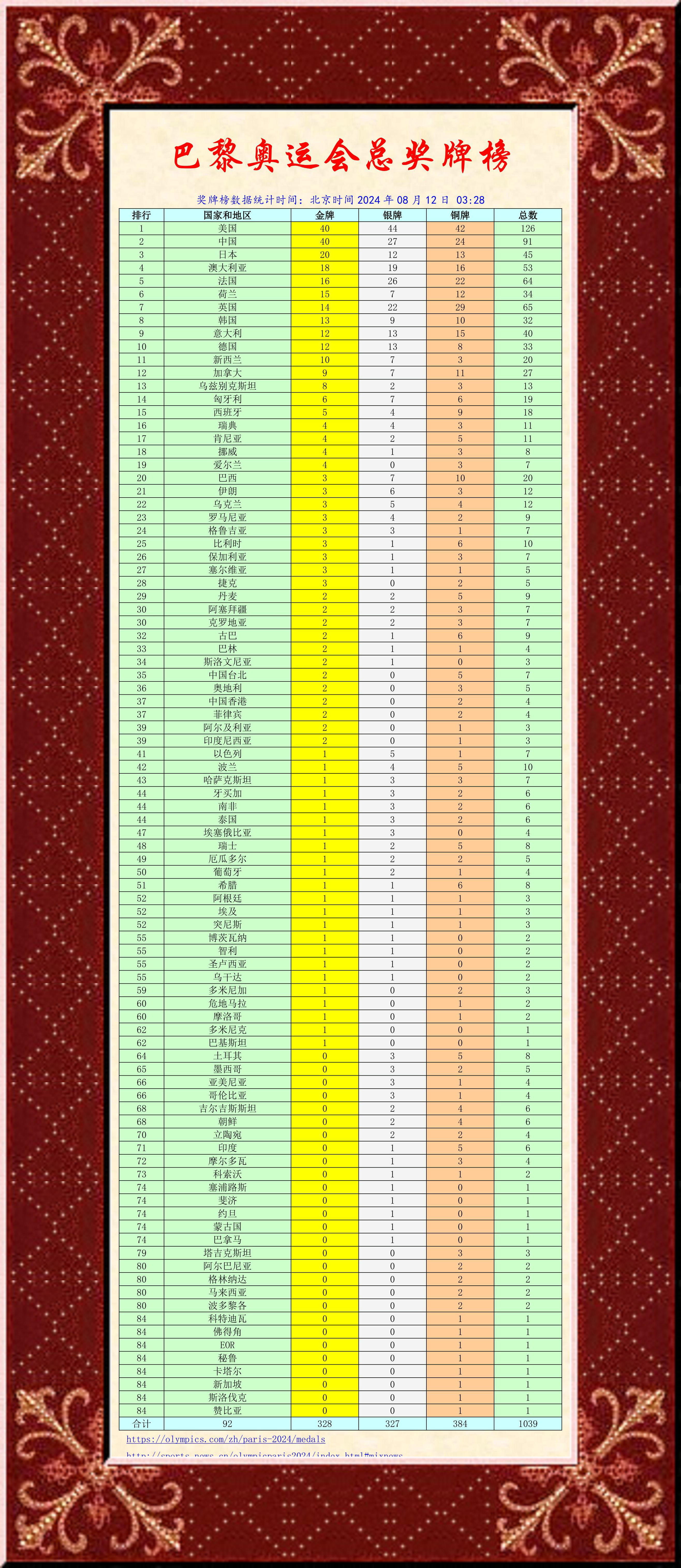 1984年,15金;1988年,5金;1992年,16金;1996年,16金;2000年,28金;2004年,32金;2008年,48金;2012年,39金;2016年,26金;2021年,38金;2024年40金。