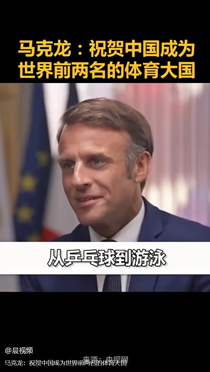 法國總統(tǒng) 馬克龍:首先,多年來貴國在體育領(lǐng)域投入很多,成為世界前兩名的體育大國,祝賀你們!從乒乓球到游泳,包括很多其他的項目取得的成績,證明了你們具備培養(yǎng)優(yōu)秀運動員的能力,并能夠激勵人心。