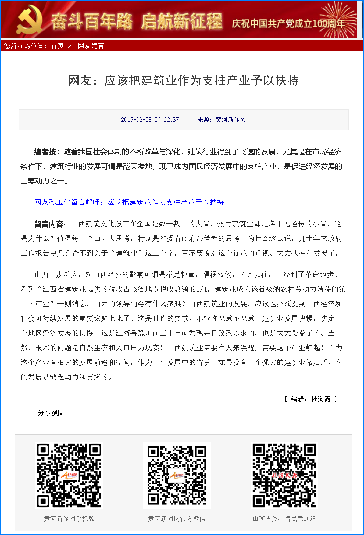 20 網(wǎng)友:應(yīng)該把建筑業(yè)作為支柱產(chǎn)業(yè)予以扶持 2015-02-08