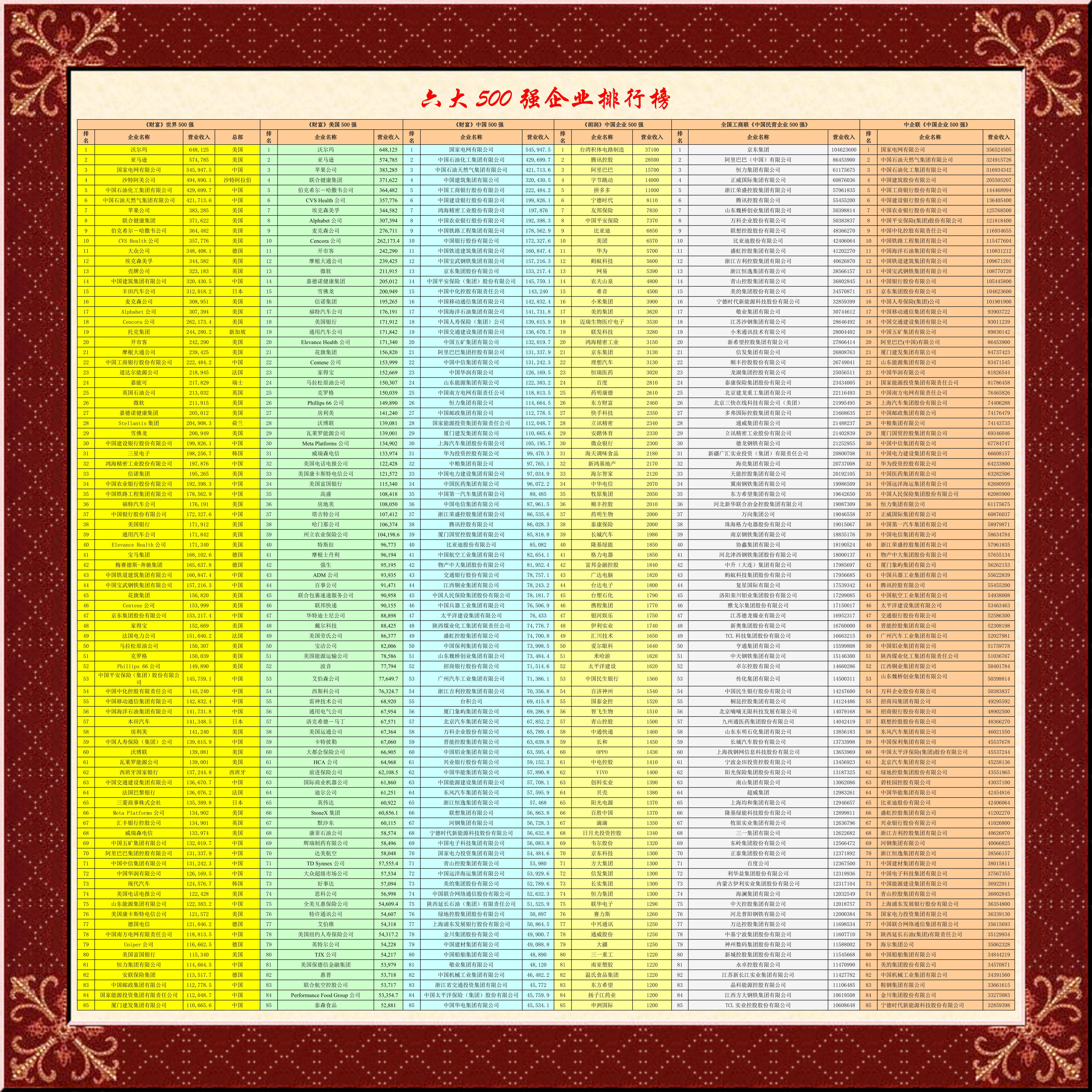 《財(cái)富》世界500強(qiáng)、美國500強(qiáng)、中國500強(qiáng),胡潤《中國500強(qiáng)》,中企聯(lián)《中國企業(yè)500強(qiáng)》和全國工商聯(lián)《中國民營企業(yè)500強(qiáng)》六大榜單,我們縱橫比較一下,看看高低差距。
