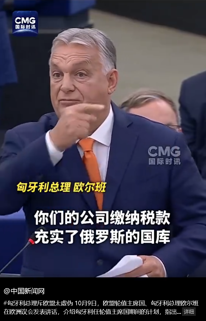 【文/觀察者網(wǎng) 齊倩】當(dāng)?shù)貢r間10月9日,匈牙利總理歐爾班在歐洲議會全體會議上發(fā)表講話時火力全開,怒批歐盟對俄羅斯能源及對華貿(mào)易政策,稱這些舉措只會“搬起石頭砸自己的腳”。他表示,歐盟禁止俄能源已嚴(yán)重影響歐盟經(jīng)濟(jì)增長,并指出,對中國電動汽車加征關(guān)稅的決定只會導(dǎo)致進(jìn)一步的失業(yè)。