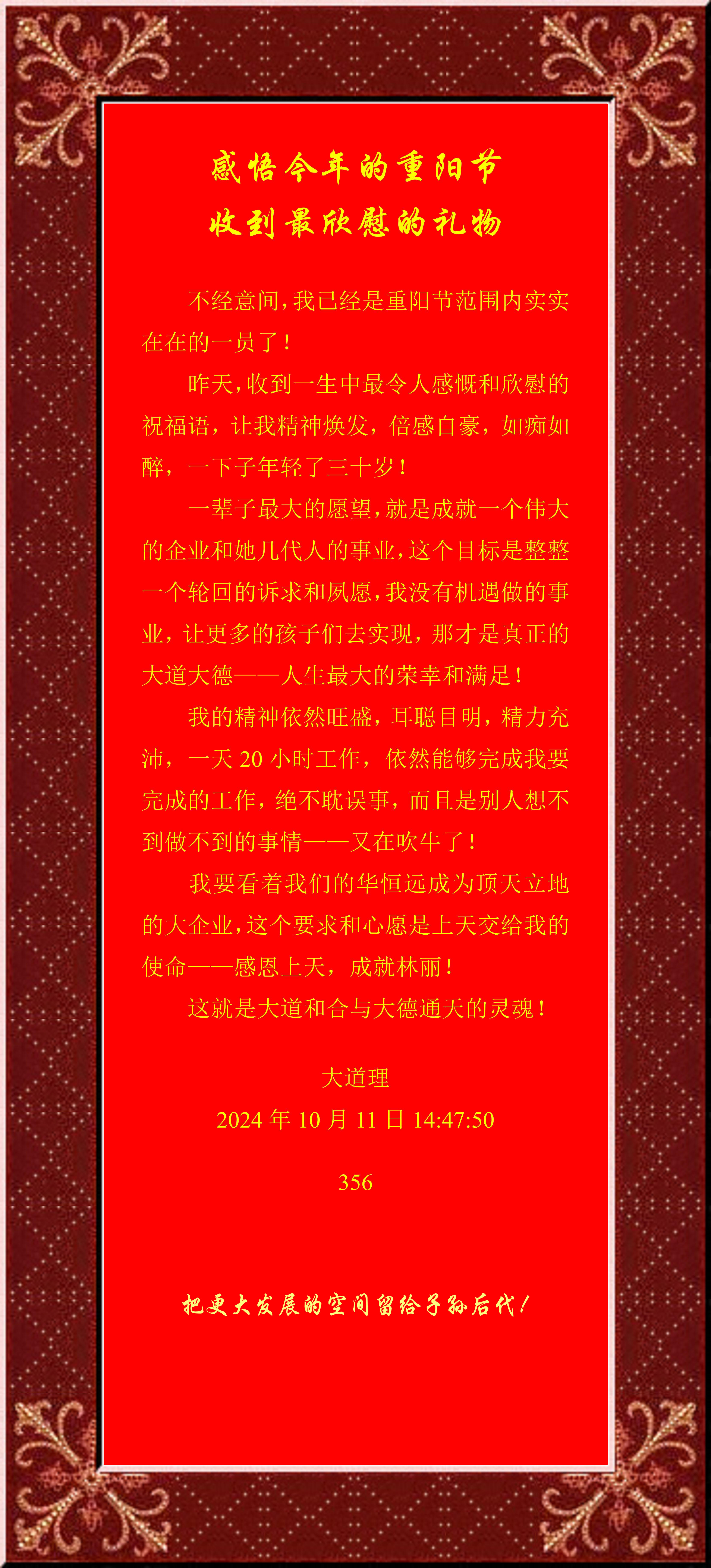 一輩子最大的愿望,就是成就一個偉大的企業(yè)和她幾代人的事業(yè),這個目標是整整一個輪回的訴求和夙愿,我沒有機遇做的事業(yè),讓更多的孩子們?nèi)崿F(xiàn),那才是真正的大道大德——人生最大的榮幸和滿足!