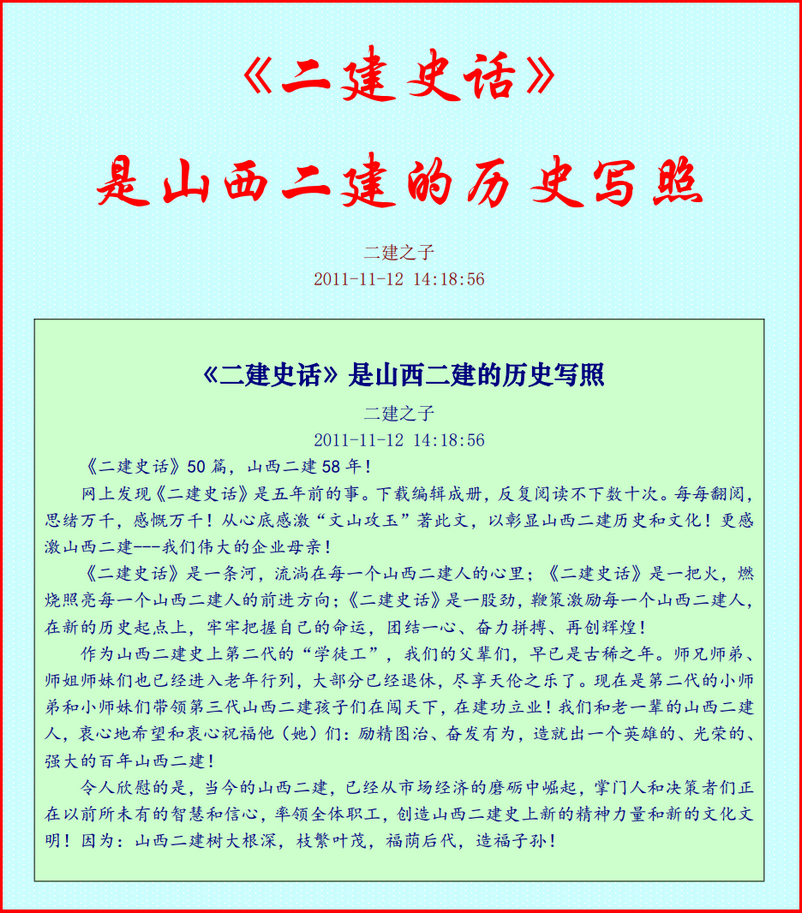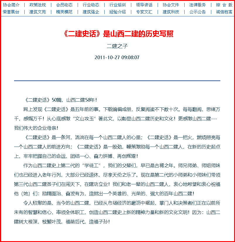 對山西三利裝飾集團(tuán)有限公司印象深刻,是2011年我撰寫《二建史話》是山西二建的歷史寫照一文,被三利集團(tuán)網(wǎng)站收入《美文欣賞》欄目之中。