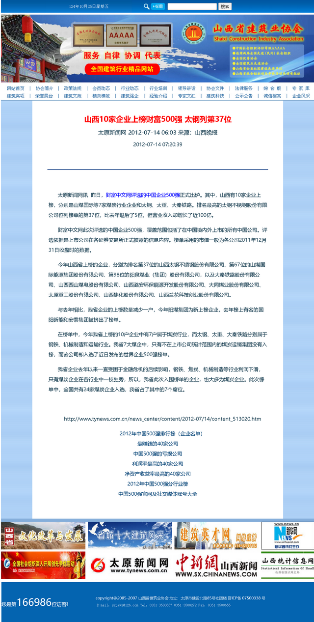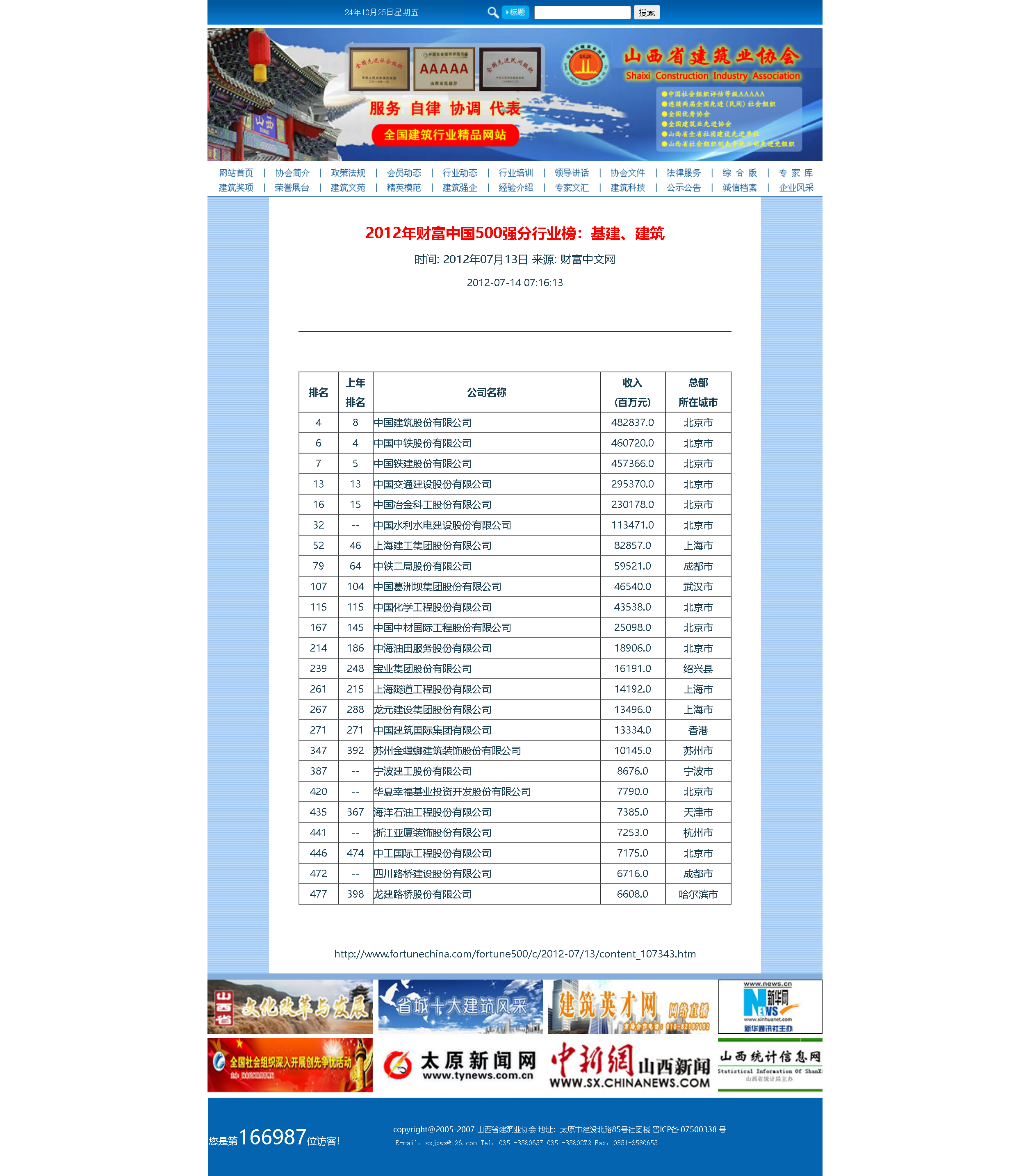 二十年前,第一次發(fā)現(xiàn)北方網(wǎng)世界500強專題報道這個欄目,激發(fā)起強烈的興趣和愛好,由此一發(fā)而不可收。尤其是在建筑業(yè)協(xié)會搞網(wǎng)站,更是把關(guān)注重點放在分門別類的排行榜上,及時轉(zhuǎn)載并且保存起來。