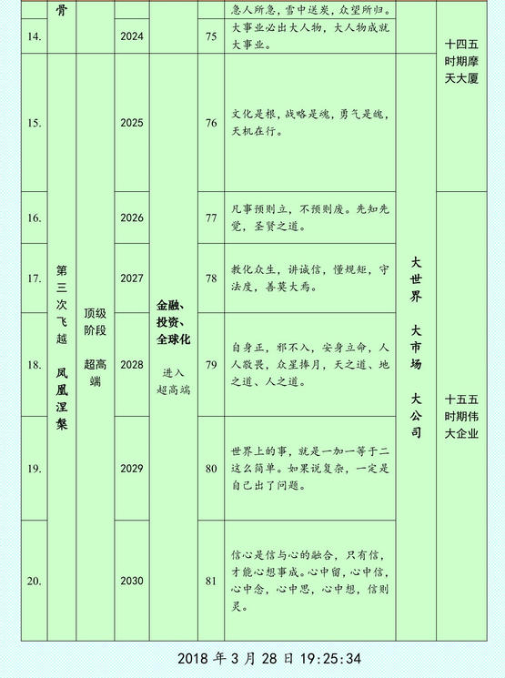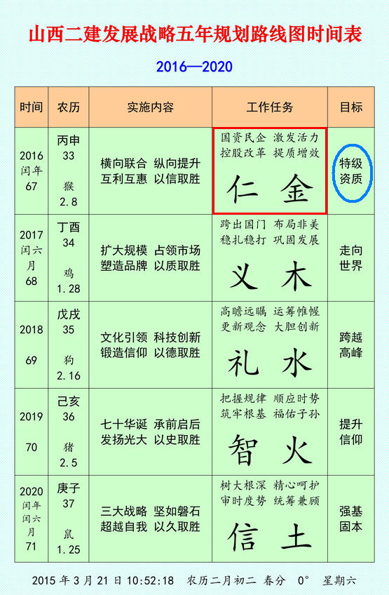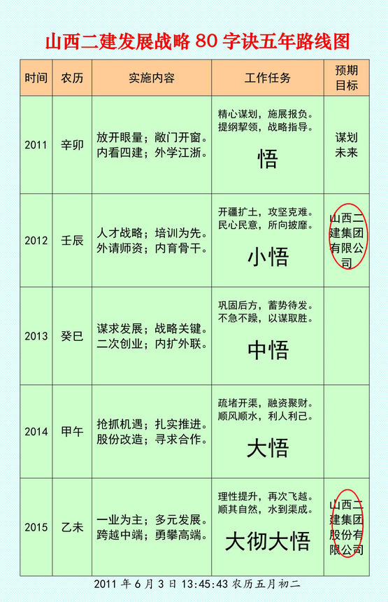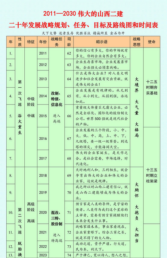 山西二建發(fā)展戰(zhàn)略五年路線圖和時(shí)間表,從2011年到2020年,分兩個(gè)五年兩個(gè)階段規(guī)劃了十年的成就,是考慮現(xiàn)實(shí)和實(shí)際的可能性與變化的環(huán)境形成的階段性感悟程度。換言之,就看決策者的維度能否自覺接受并且堅(jiān)定不移去執(zhí)行!任何事物,懷疑或者遲滯,必將功虧一簣事倍功半!重回大道,二十年以后的事情了!