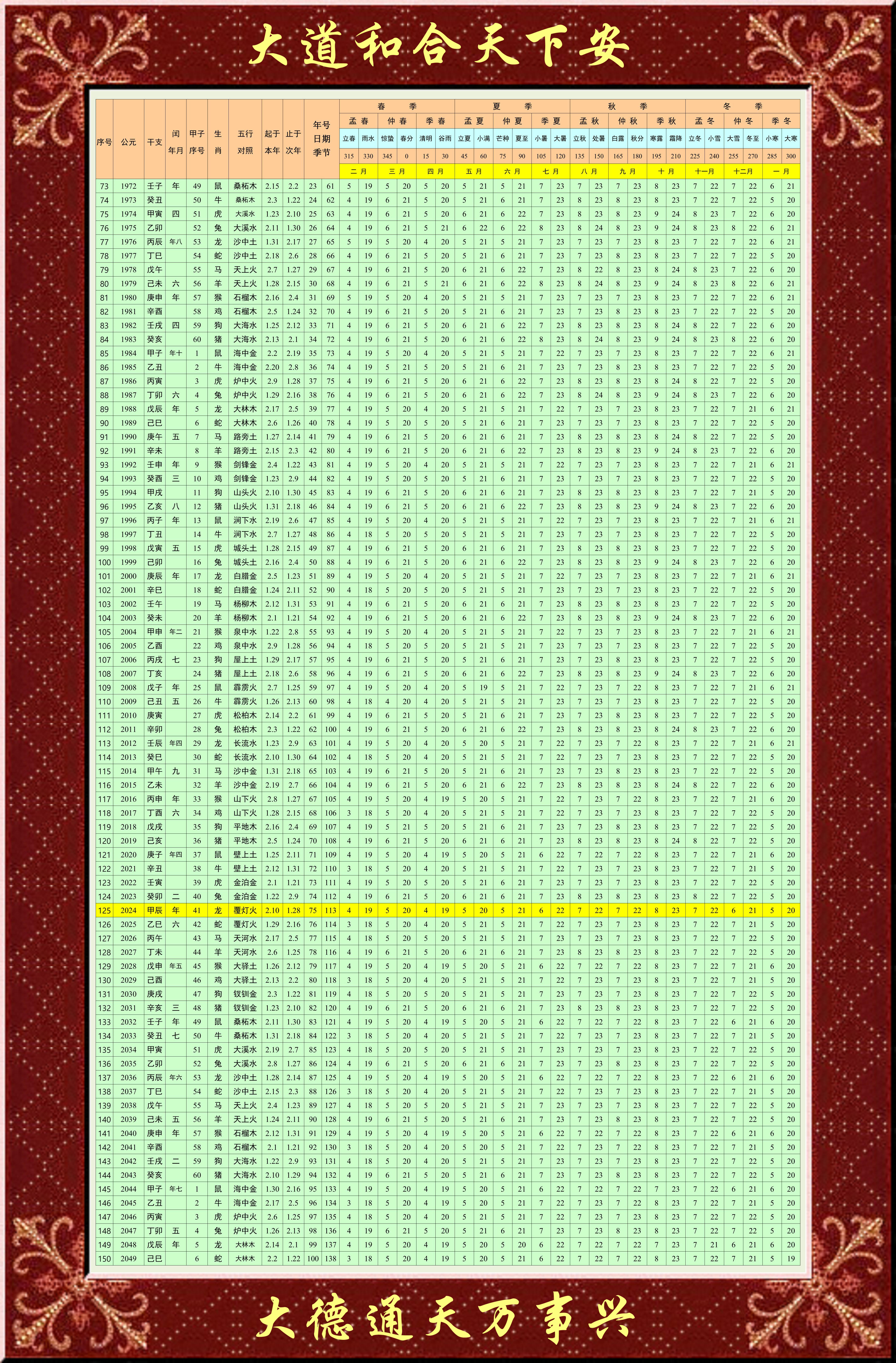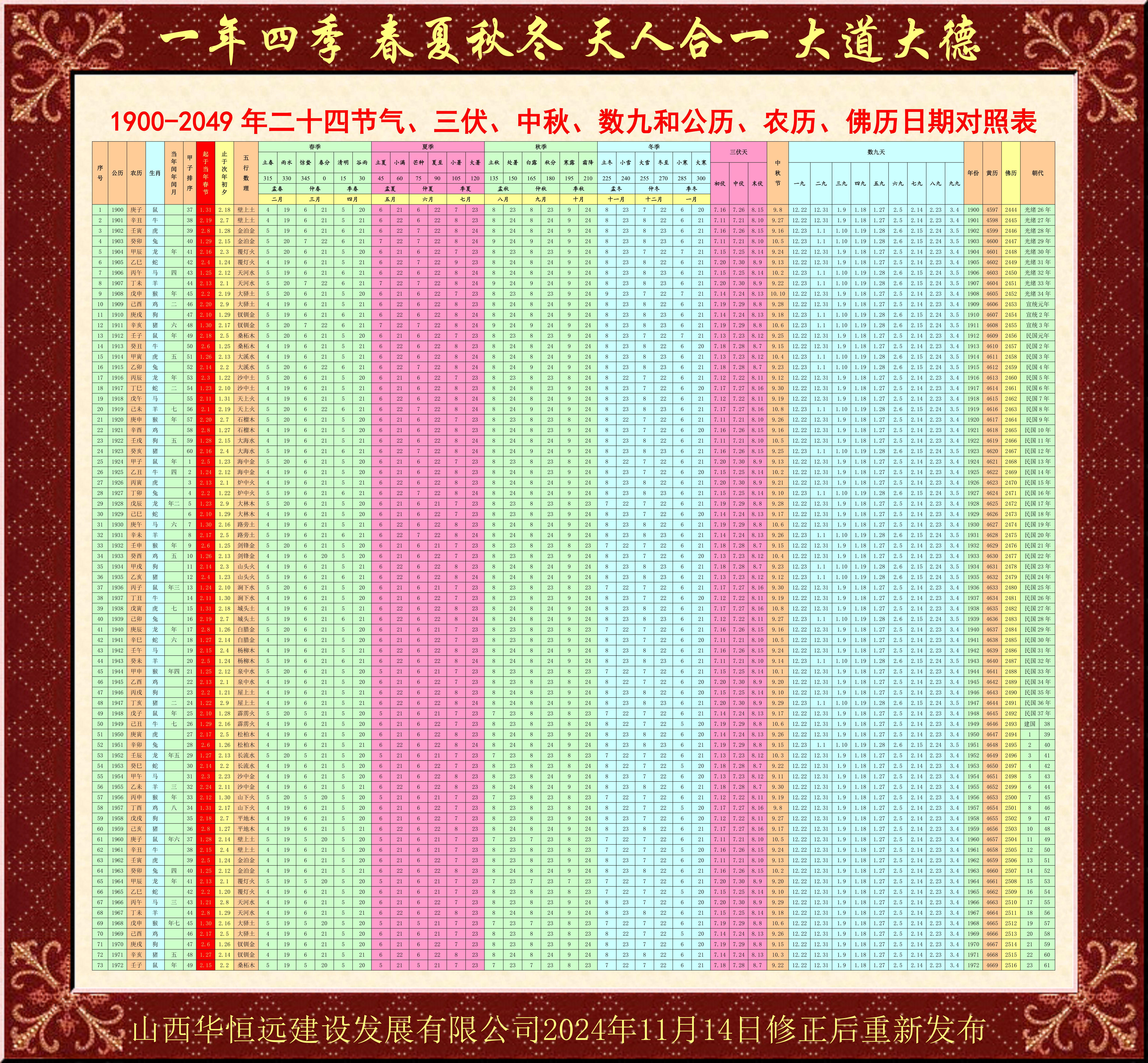 今天重新發(fā)布經(jīng)過(guò)修正后的《一百五十年一年四季二十四節(jié)氣》二表,目的是從中感應(yīng)世界和人類社會(huì)在輪回中的變化,哪些年份風(fēng)調(diào)雨順五谷豐登,哪些年份大自然會(huì)發(fā)生災(zāi)難,達(dá)到先知先覺預(yù)見未來(lái),這是一門科學(xué)中的科學(xué),超越時(shí)間空間的大學(xué)問(wèn),希望有緣人能夠達(dá)到通靈的高超境界!