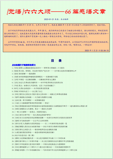這是2019年3月9日至9月13日在日月峰網(wǎng)上發(fā)布過(guò)的46篇人生實(shí)踐體驗(yàn)和體會(huì),以《[座標(biāo)]找準(zhǔn)自己的人生位置》起頭,到《中秋寄語(yǔ)》收尾,寓意事物發(fā)展從無(wú)到有從初一到十五的規(guī)律和法則,即感悟到感應(yīng)形成靈感的過(guò)程,把屬于自己的潛意識(shí)激活,明白事物發(fā)生發(fā)展全過(guò)程和預(yù)見(jiàn)未來(lái)的真功夫,可以說(shuō)這是我人生最大的財(cái)富和為后代準(zhǔn)備的最有價(jià)值的禮物!