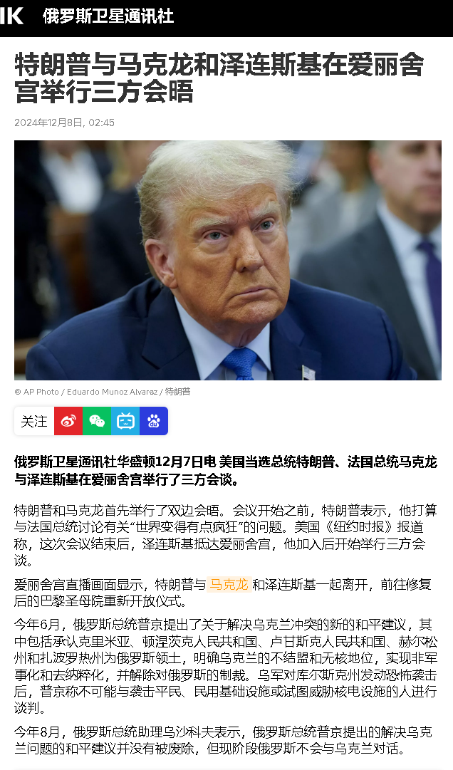 新華社巴黎12月7日電(記者喬本孝)法國(guó)總統(tǒng)馬克龍7日在愛麗舍宮與受邀出席巴黎圣母院重新開放儀式的美國(guó)當(dāng)選總統(tǒng)特朗普和烏克蘭總統(tǒng)澤連斯基舉行三方會(huì)晤。