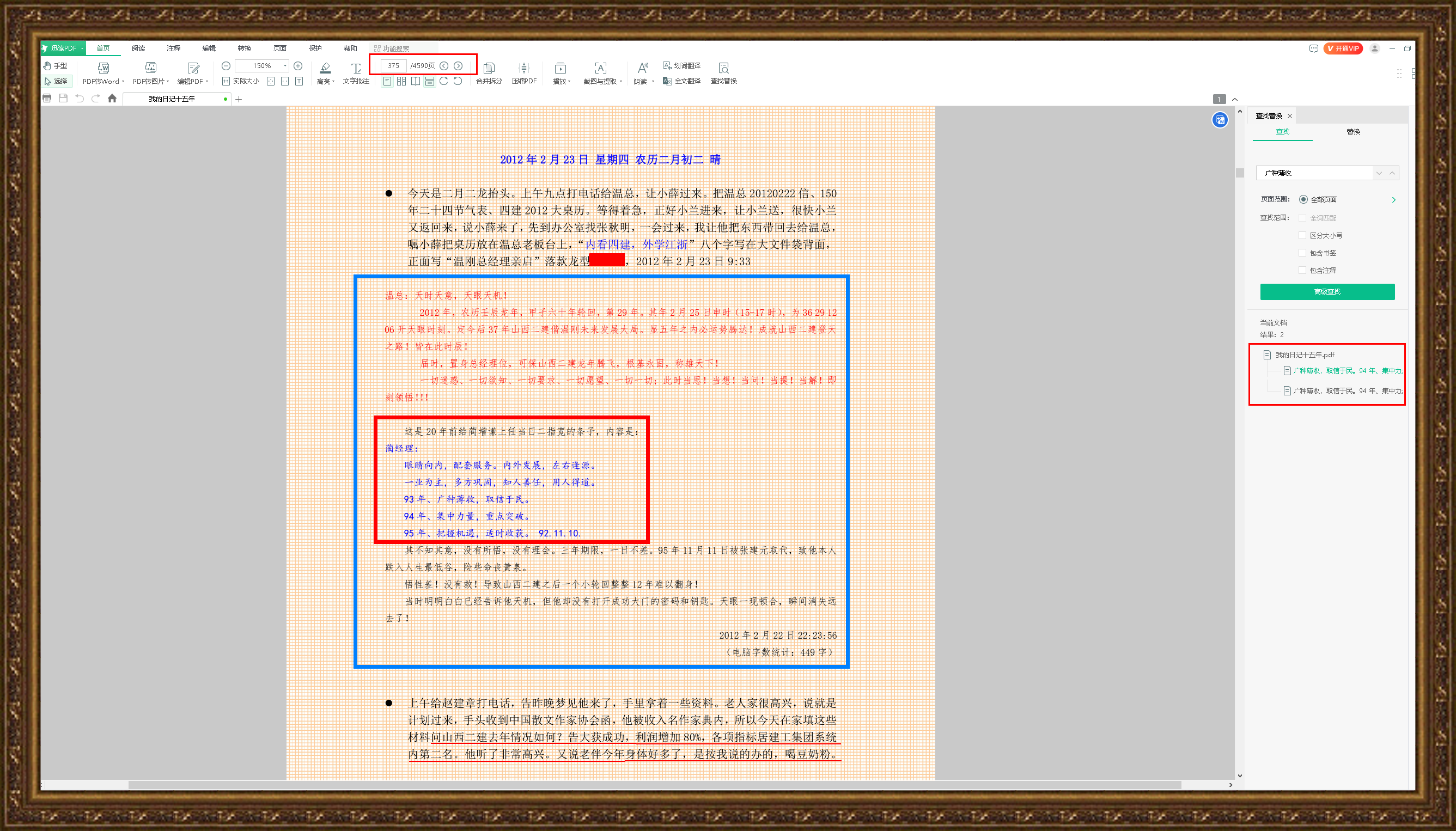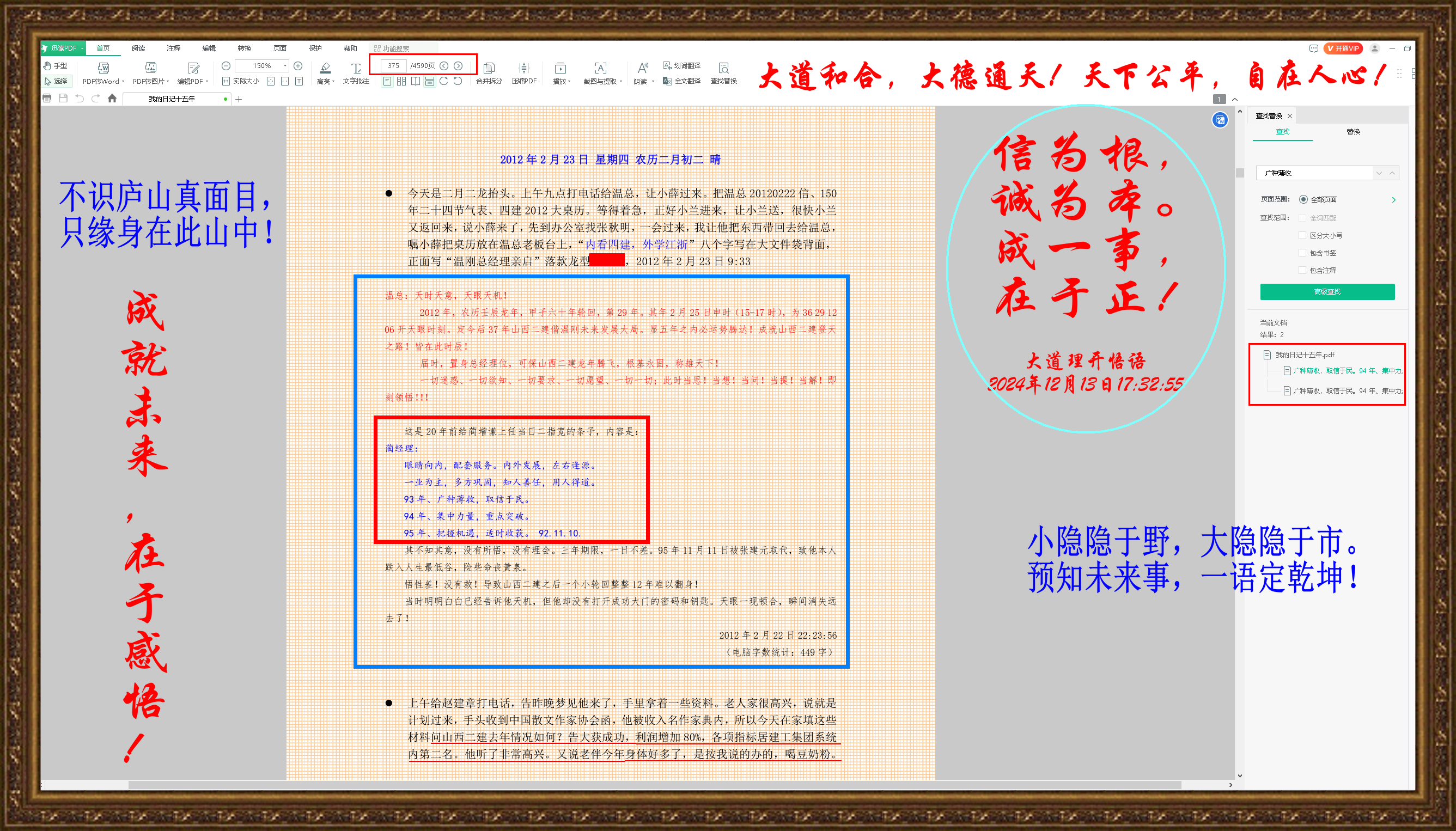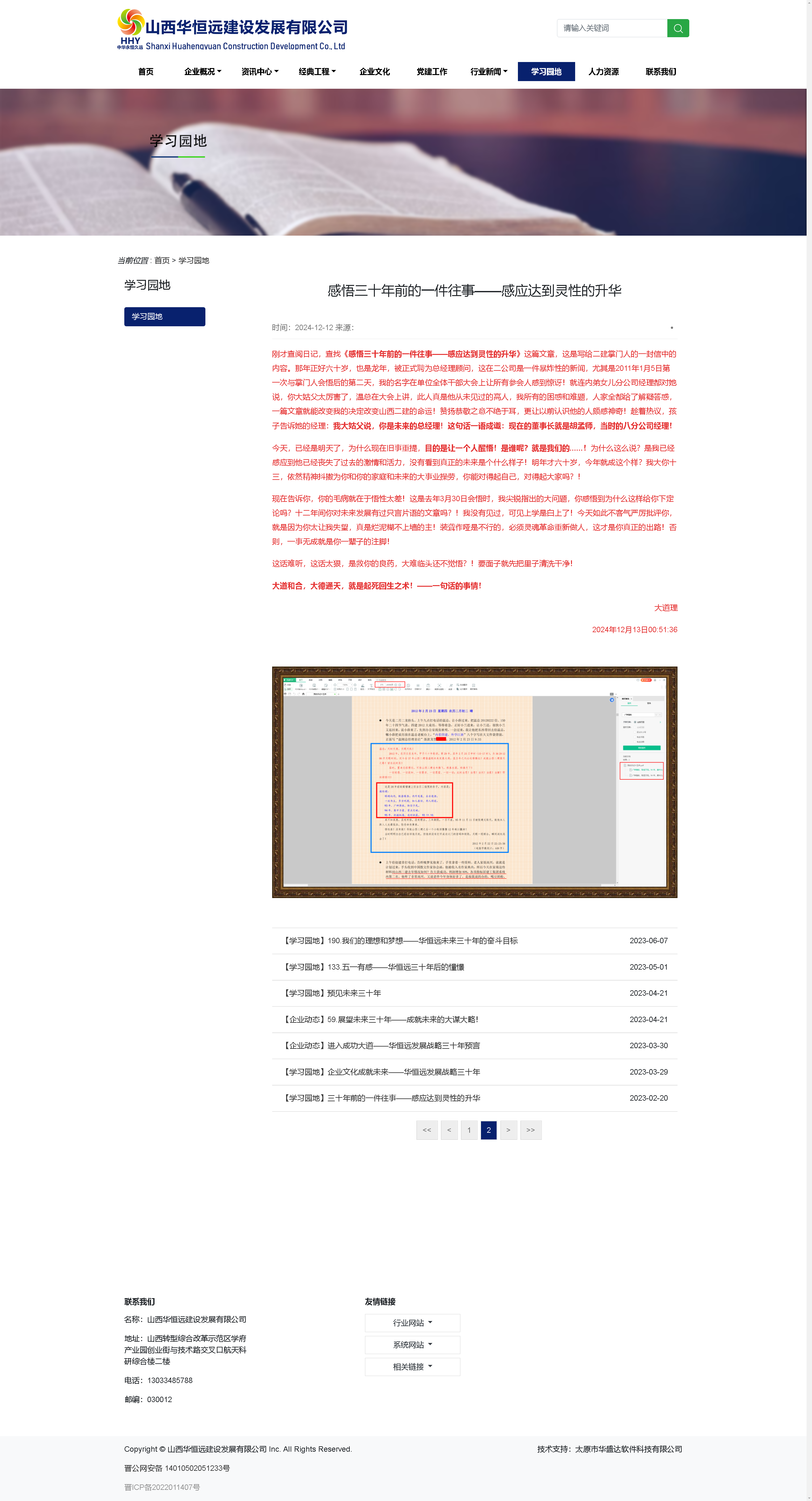剛才查閱日記,查找《感悟三十年前的一件往事——感應(yīng)達(dá)到靈性的升華》這篇文章,這是寫給二建掌門人的一封信中的內(nèi)容。那年正好六十歲,也是龍年,被正式聘為總經(jīng)理顧問,這在二公司是一件暴炸性的新聞,尤其是2011年1月5日第一次與掌門人會悟后的第二天,我的名字在單位全體干部大會上讓所有參會人感到驚訝!就連內(nèi)弟女兒分公司經(jīng)理都對她說,你大姑父太厲害了,溫總在大會上講,此人真是他從未見過的高人,我所有的困惑和難題,人家全都給了解疑答惑,一篇文章就能改變我的決定改變山西二建的命運!贊揚恭敬之意不絕于耳,更讓以前認(rèn)識他的人頗感神奇!趁著熱議,孩子告訴她的經(jīng)理:我大姑父說,你是未來的總經(jīng)理!這句話一語成讖:現(xiàn)在的董事長就是胡孟師,當(dāng)時的八分公司經(jīng)理!