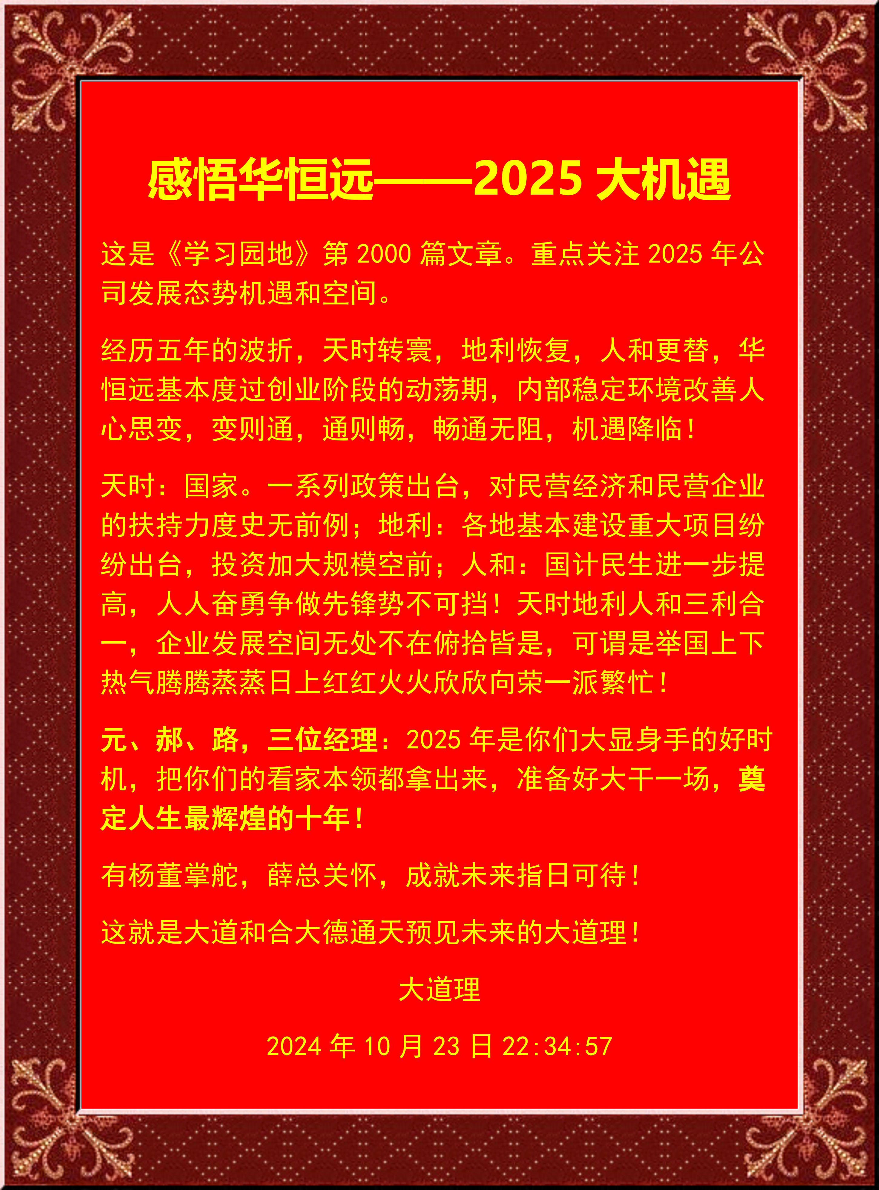 去年3月30日會晤,現(xiàn)在公司中任職有六人,其余四人為公司外圍發(fā)展戰(zhàn)略和未來的自家人。今年最大的收獲,是蘇女士張先生夫婦成為華恒遠(yuǎn)成就未來大空間永久的戰(zhàn)略合作伙伴!這就應(yīng)驗(yàn)了十三這個(gè)吉祥如意人氣數(shù),與我們公司名稱相輔相成的還有太原華盛達(dá)軟件科技有限公司和山西富新廣建達(dá)建材有限公司,三個(gè)十三相加三十九,就是天機(jī)!