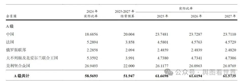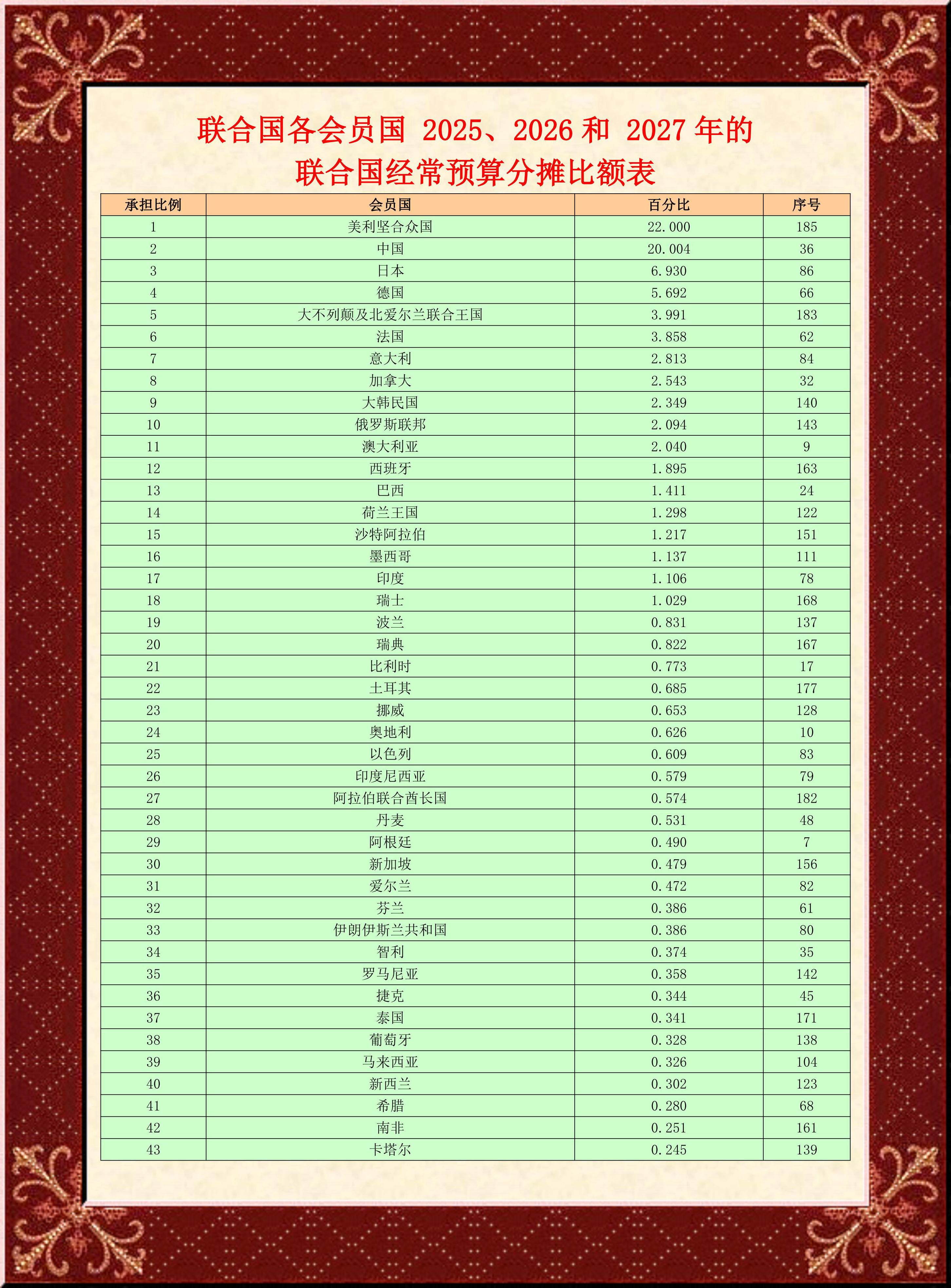 2022-2024年,中國(guó)的分?jǐn)偙葹?5.254%,每年依次繳納4.76億美元、5.18億美元、5.48億美元,合計(jì)繳納15.42億美元。中國(guó)因?yàn)閺?qiáng)勁的經(jīng)濟(jì)表現(xiàn)與影響力,占比由目前的15.254%增加4.75%,達(dá)到20.004%。這也是中國(guó)占比首超20%,直逼美國(guó)的22%。未來三年,即使每年的會(huì)費(fèi)均為37.17億美元,那么中國(guó)合計(jì)需繳納22.30億美元。換言之,2025-2027年中國(guó)至少要多繳納6.88億美元,折合人民幣約50.21億。需要注意的是,聯(lián)合國(guó)的常規(guī)預(yù)算每年都有小幅增長(zhǎng),因此中國(guó)的實(shí)際繳納金額可能會(huì)更高。