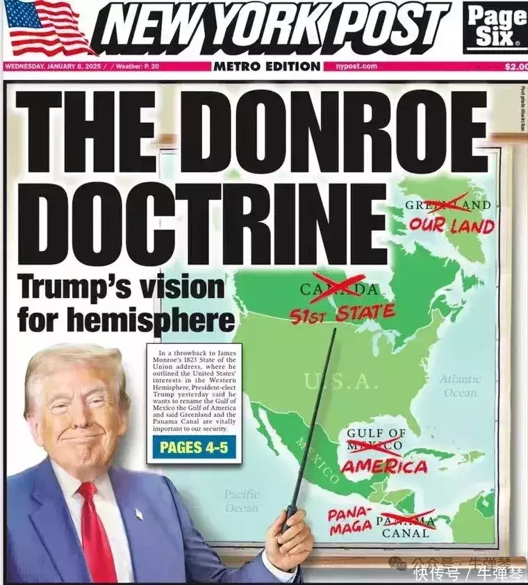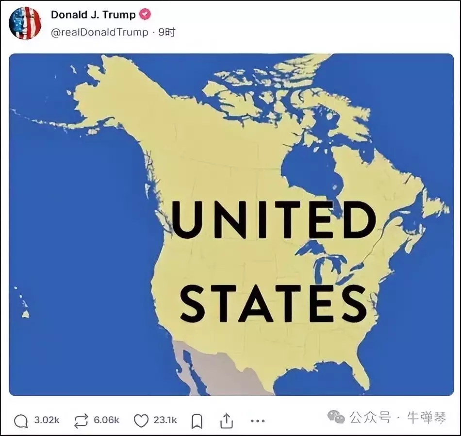 事實上,在轉(zhuǎn)發(fā)這張圖之前,特朗普更放出話來,拒絕排除“以軍事或經(jīng)濟脅迫手段控制巴拿馬運河和格陵蘭島”的可能性,并再度提及“吞并加拿大”。