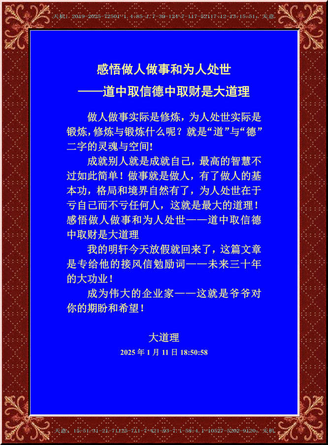 成就別人就是成就自己,最高的智慧不過(guò)如此簡(jiǎn)單!做事就是做人,有了做人的基本功,格局和境界自然有了,為人處世在于虧自己而不虧任何人,這就是最大的道理!感悟做人做事和為人處世——道中取信德中取財(cái)是大道理