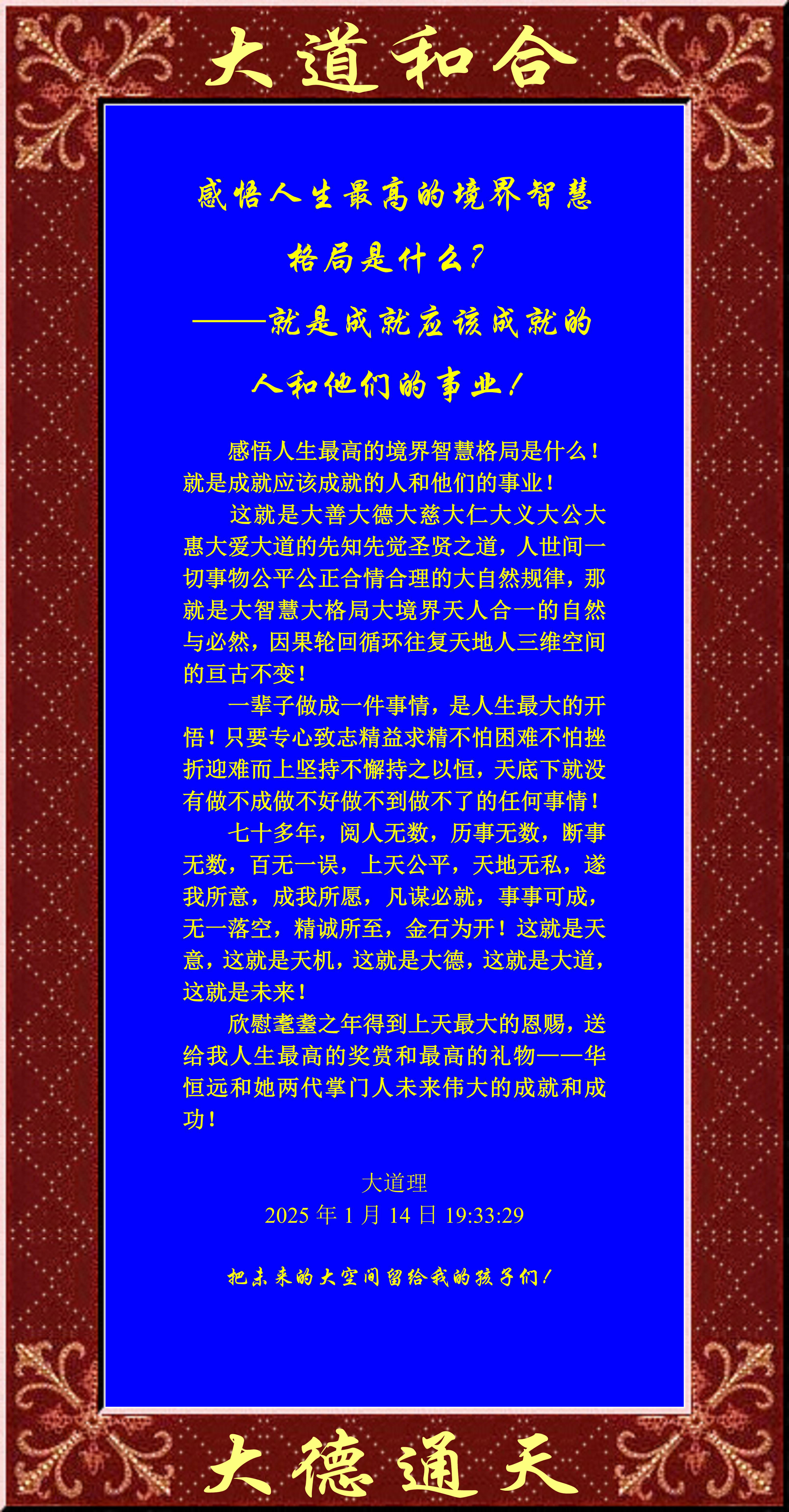這就是大善大德大慈大仁大義大公大惠大愛大道的先知先覺圣賢之道,人世間一切事物公平公正合情合理的大自然規(guī)律,那就是大智慧大格局大境界天人合一的自然與必然,因果輪回循環(huán)往復(fù)天地人三維空間的亙古不變!