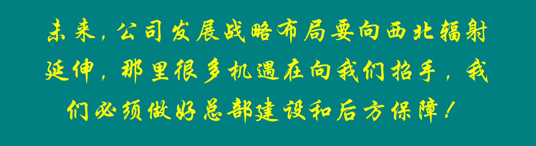 剛才,掌門人新疆發(fā)回信息,回復(fù):“可,拿下!為下一步鋪路!”未來(lái),公司發(fā)展戰(zhàn)略布局要向西北輻射延伸,那里很多機(jī)遇在向我們招手,我們必須做好總部建設(shè)和后方保障!