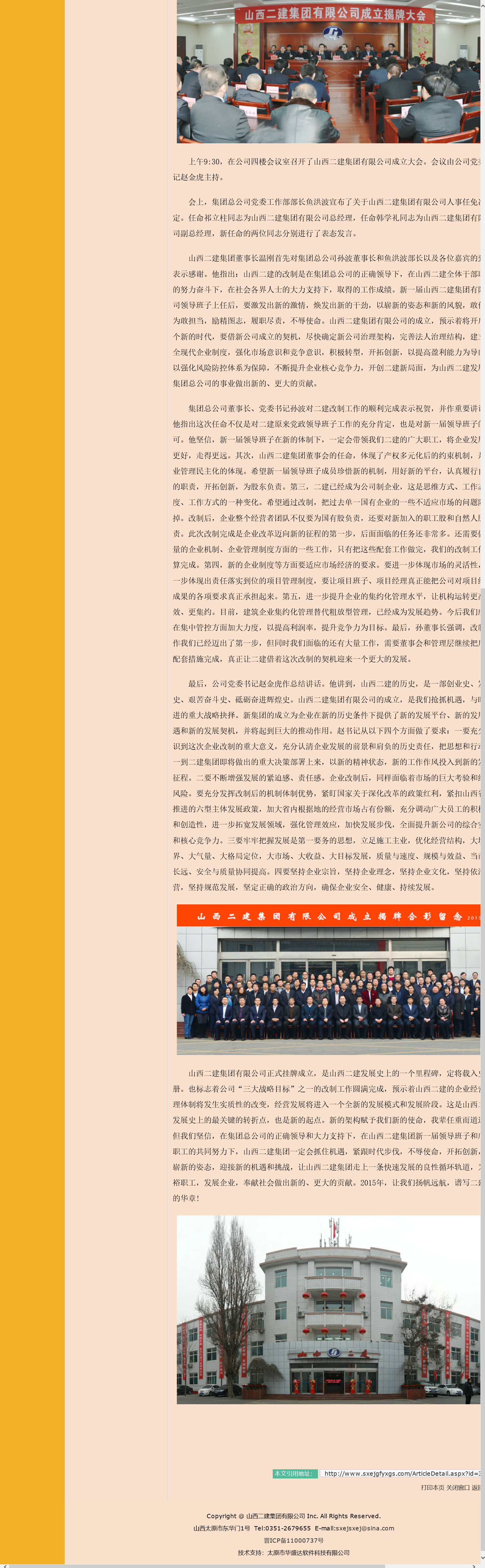 當(dāng)時(shí),他立刻打電話通知對(duì)方原路返回,表示承擔(dān)一切損失。隨后完全按照我的意見(jiàn)實(shí)施,就連字體都是征求我的意見(jiàn)制作的。2015年1月5日,山西二建集團(tuán)有限公司揭牌儀式順利進(jìn)行,使用近三十五年的山西省第二建筑工程公司名稱正式退出歷史舞臺(tái),宣告改制后的山西二建正式成立!