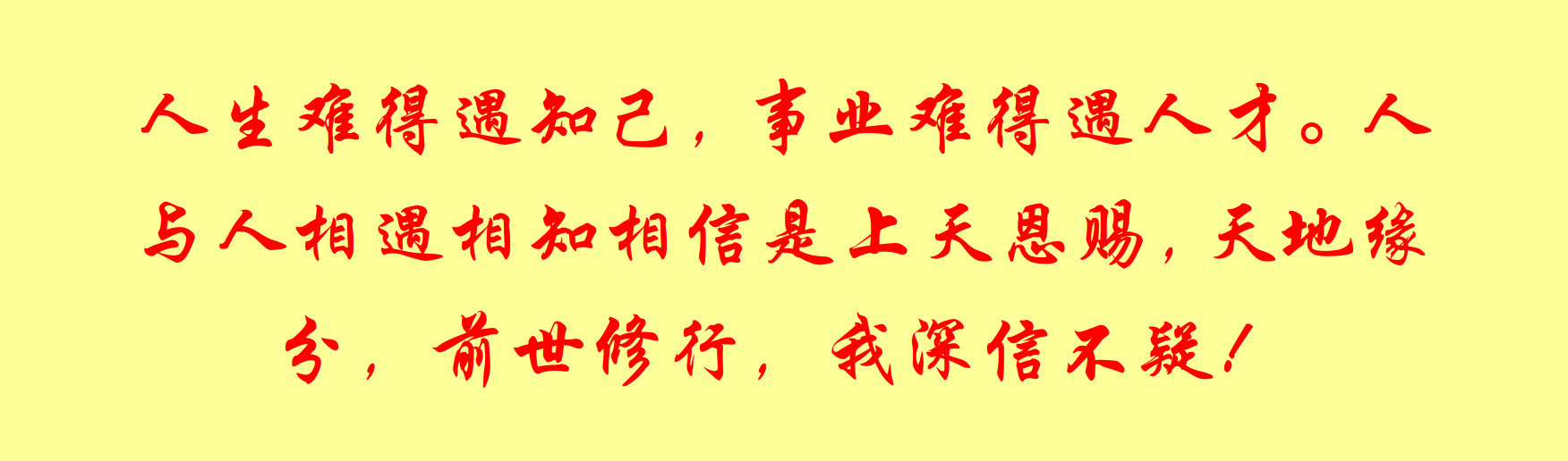 人生難得遇知己,事業(yè)難得遇人才。人與人相遇相知相信是上天恩賜,天地緣分,前世修行,我深信不疑!無緣即無份,對面不相識,老死不往來,這就是天意!為什么人世間那么多人,而偏偏能夠進(jìn)入你的心里的人那么少,那么重要,那么讓你心甘情愿為他們付出,為他們奮斗,為他們活著呢?!這不是天意又是什么?!