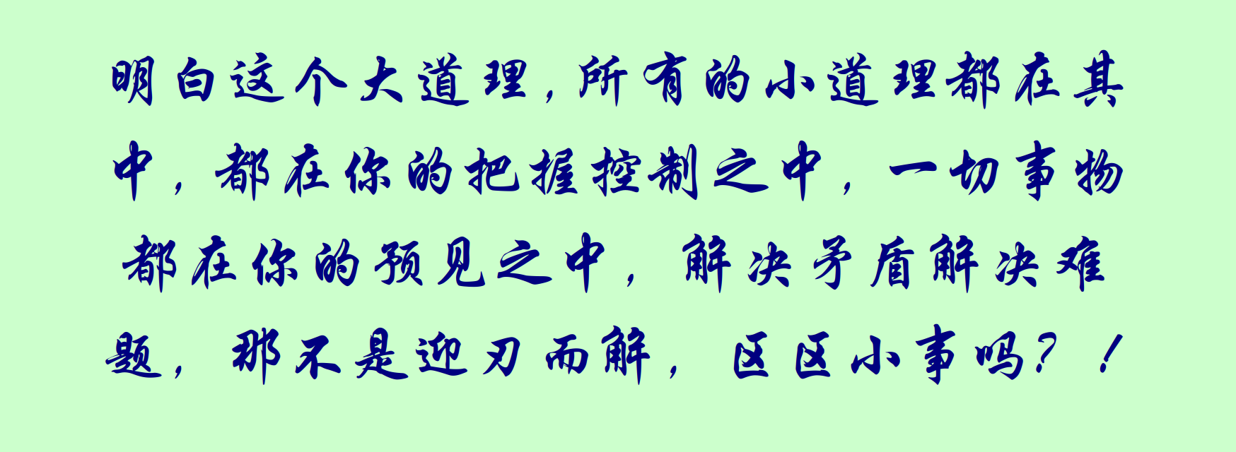 明白這個(gè)大道理,所有的小道理都在其中,都在你的把握控制之中,一切事物都在你的預(yù)見之中,解決矛盾解決難題,那不是迎刃而解,區(qū)區(qū)小事嗎?!