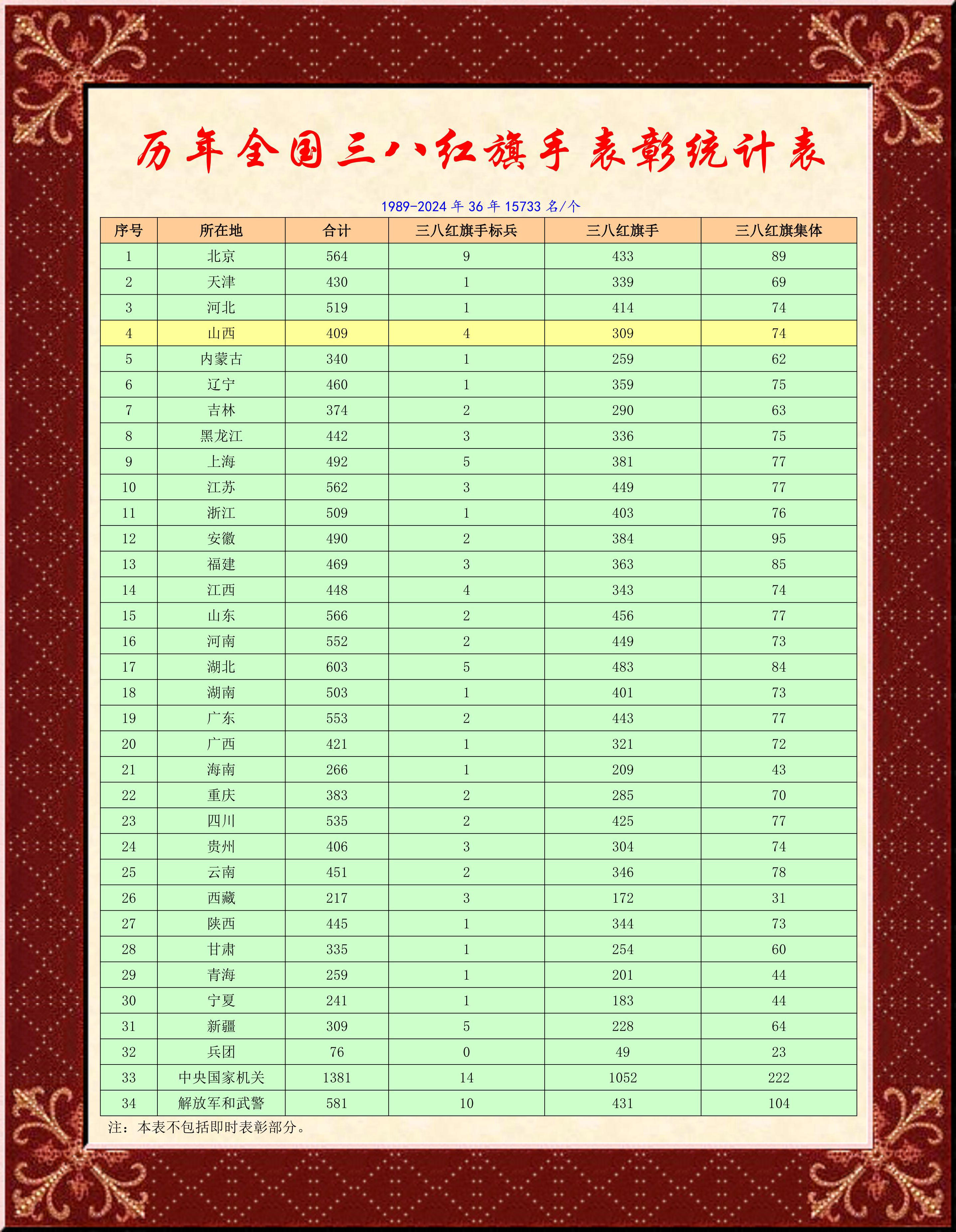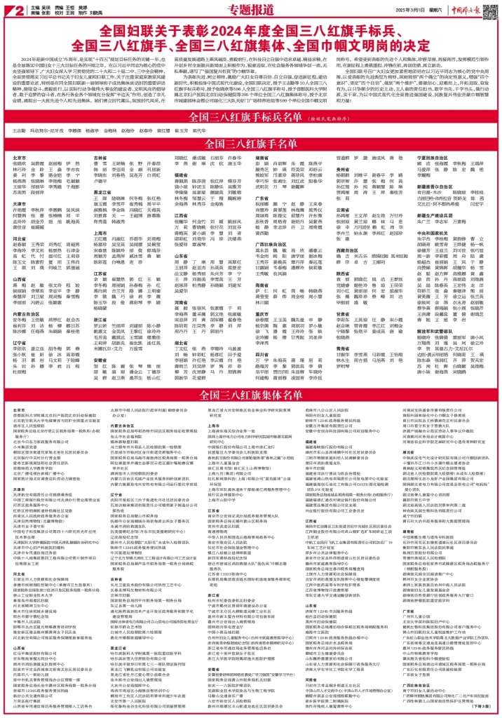 三八紅旗標(biāo)兵4名、三八紅旗手329、三八紅旗集體76個(gè),共計(jì)409名/個(gè)