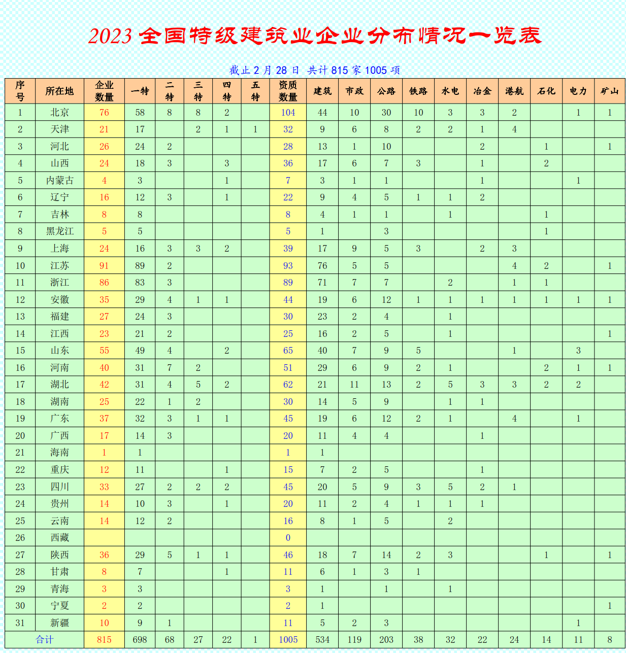 核準(zhǔn)的資質(zhì)項(xiàng)分別是:機(jī)電56項(xiàng),鋼結(jié)構(gòu)27項(xiàng),建筑14項(xiàng),礦山4項(xiàng),橋梁3項(xiàng),電力3項(xiàng),隧道2項(xiàng),公路1項(xiàng),市政1項(xiàng),輸變電1項(xiàng),冶金1項(xiàng)。