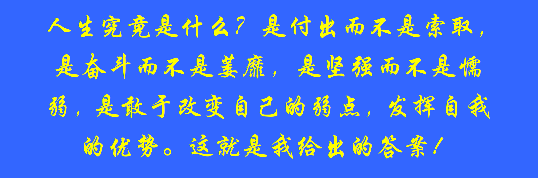 一個(gè)有理想信念的人,必然把人生作為一種責(zé)任嚴(yán)肅對(duì)待,必然把困難和斗爭(zhēng)作為人生的命題認(rèn)真思考,我為什么來(lái)又為什么做,如何把工作做到極致,做到滿意,做到無(wú)可挑剔,那就是成就別人正是成就自己最佳的選擇,這才是一個(gè)有良知人的正確人生態(tài)度!