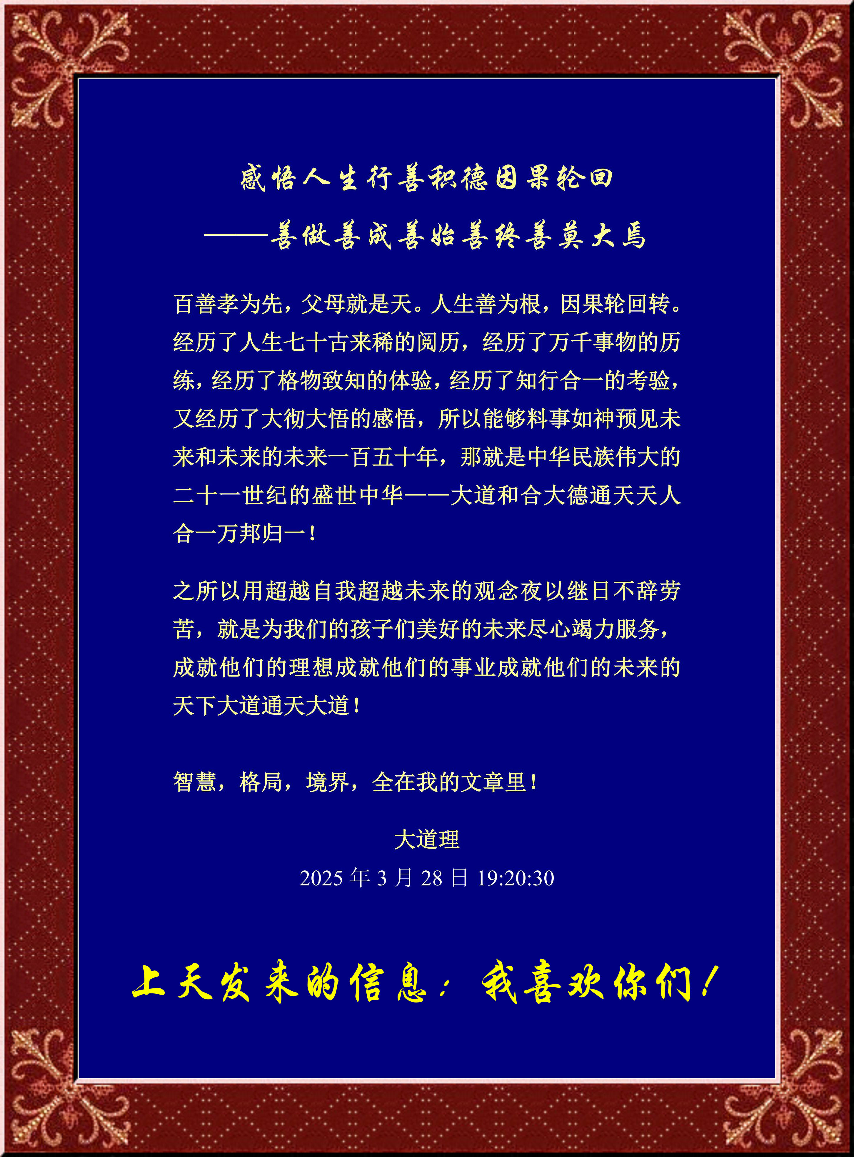 經(jīng)歷了人生七十古來(lái)稀的閱歷,經(jīng)歷了萬(wàn)千事物的歷練,經(jīng)歷了格物致知的體驗(yàn),經(jīng)歷了知行合一的考驗(yàn),又經(jīng)歷了大徹大悟的感悟,所以能夠料事如神預(yù)見(jiàn)未來(lái)和未來(lái)的未來(lái)一百五十年,那就是中華民族偉大的二十一世紀(jì)的盛世中華——大道和合大德通天天人合一萬(wàn)邦歸一!