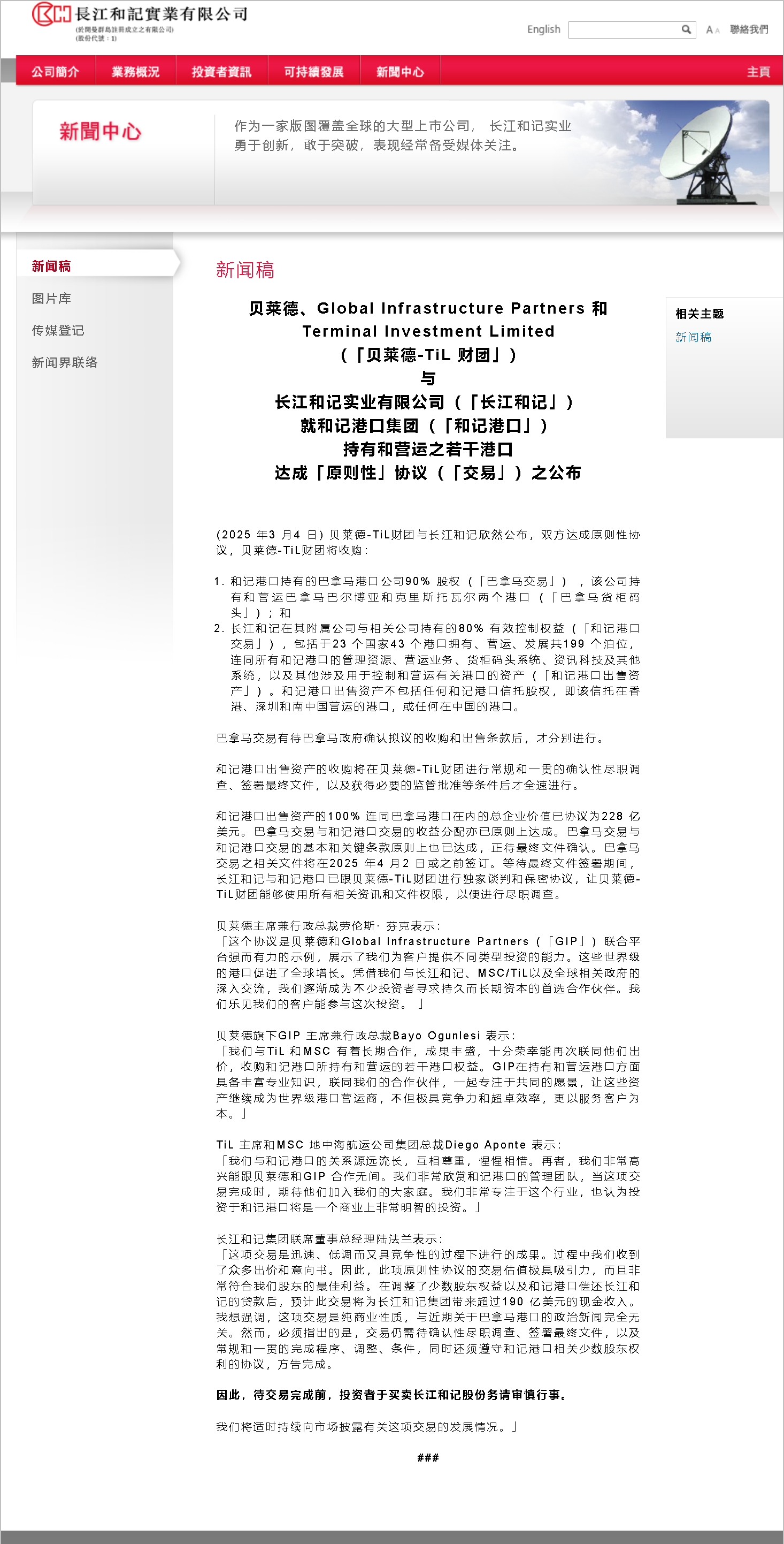 和記港口出售資產的100% 連同巴拿馬港口在內的總企業(yè)價值已協(xié)議為228 億美元。巴拿馬交易與和記港口交易的收益分配亦已原則上達成。巴拿馬交易與和記港口交易的基本和關鍵條款原則上也已達成,正待最終文件確認。巴拿馬交易之相關文件將在2025 年4 月2 日或之前簽訂。等待最終文件簽署期間,長江和記與和記港口已跟貝萊德-TiL財團進行獨家談判和保密協(xié)議,讓貝萊德-TiL財團能夠使用所有相關資訊和文件權限,以便進行盡職調查。