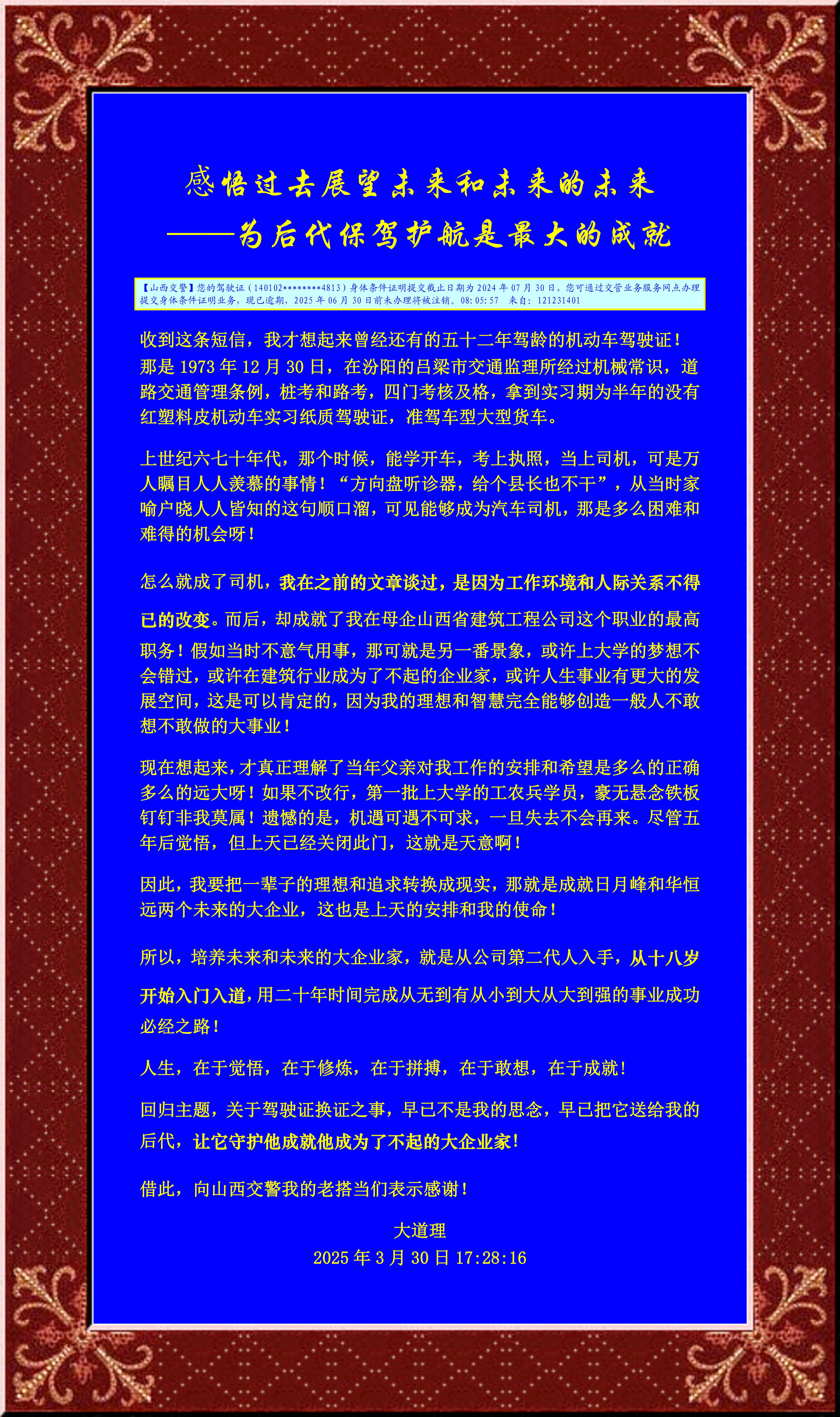 回歸主題,關(guān)于駕駛證換證之事,早已不是我的思念,早已把它送給我的后代,讓它守護(hù)他成就他成為了不起的大企業(yè)家!