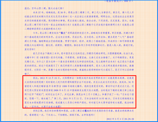 因此,2012年12月23日,太陽照樣會一如既往地升起在世界的東方!這就是根本規(guī)律,這就是大自然的自然現(xiàn)象!到時候杞人憂天的所謂瑪雅預(yù)言會不攻自破,并且從此成為歷史笑談。說起來,91年曾經(jīng)有人和我打賭諾查丹馬斯預(yù)言1999年地球大爆炸,我的態(tài)度是否定的,事實印證只是泛泛之論。還有巴西大預(yù)言家朱瑟里諾說2008年9月13中國海南發(fā)生毀滅性大地震,當(dāng)時我在下載的這篇文章上批注兩個紅字“胡說!”,時間過去幾年了,并無此事。倒是去年三月十日晚上,和妻子說了一句:“日本這個國家,忽塌一下,海水淹了。”第二天,2011年3月11日,日本當(dāng)?shù)貢r間14時46分,日本東北部海域發(fā)生里氏9.0級地震并引發(fā)海嘯,造成重大人員傷亡和財產(chǎn)損失。針對前幾年太原市謠傳有大地震,我當(dāng)時斷言:一百年內(nèi),太原不會有大地震!