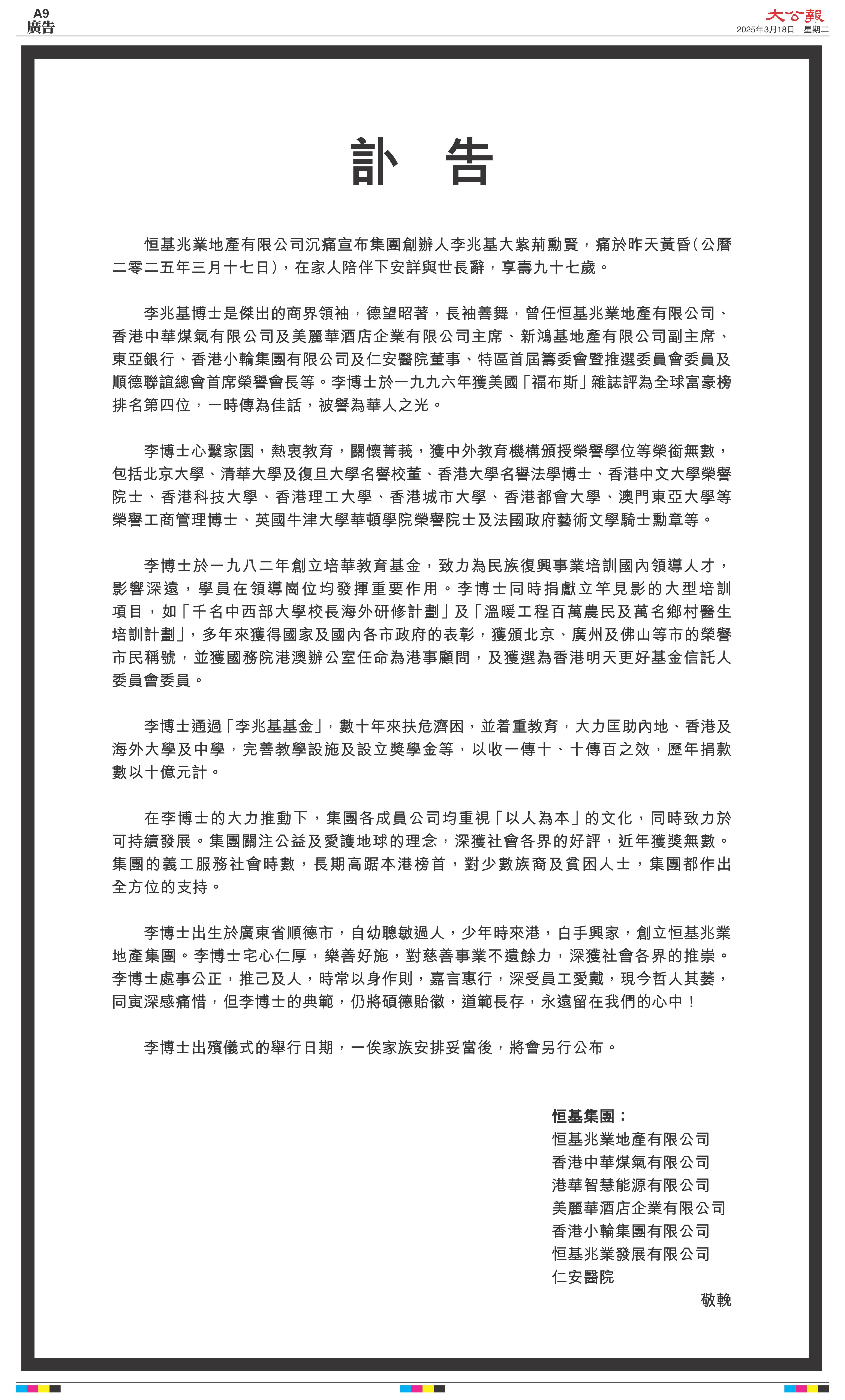 卸任恒基兆業(yè)主席,由兒子李家傑、李家誠(chéng)接管