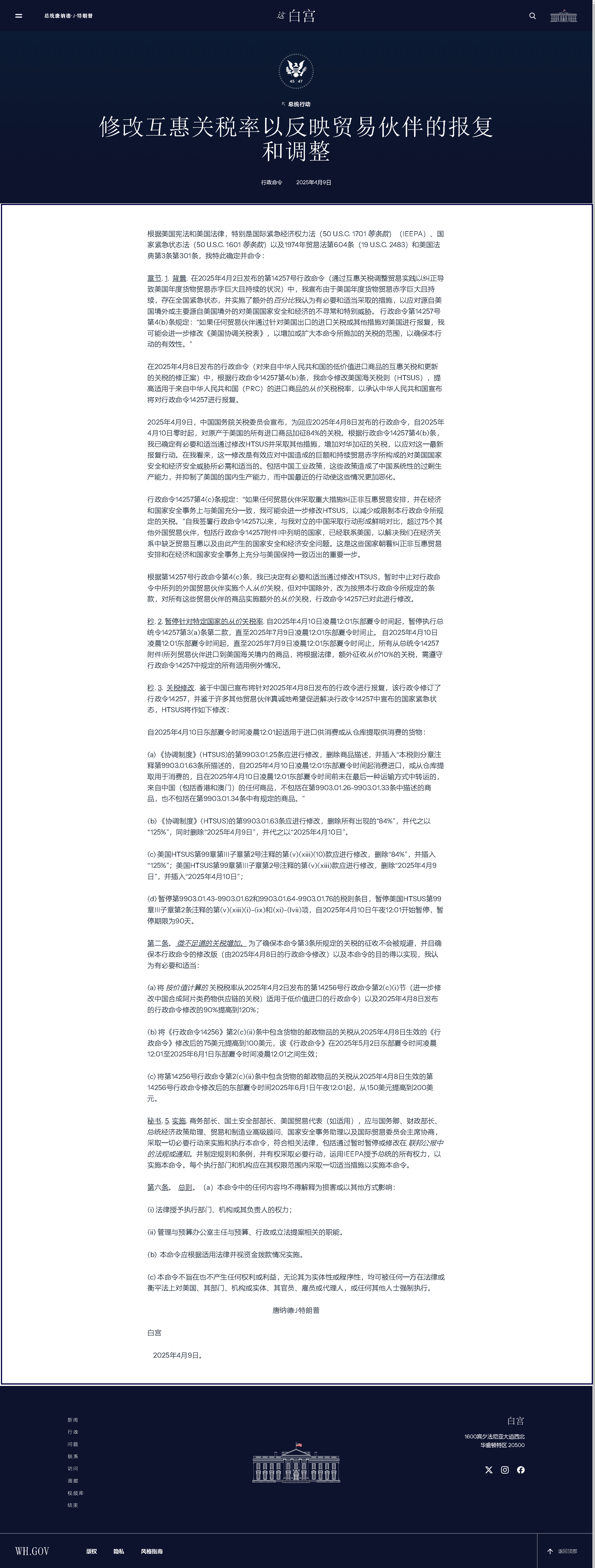根據(jù)美國(guó)憲法和美國(guó)法律,特別是國(guó)際緊急經(jīng)濟(jì)權(quán)力法(50 U.S.C. 1701 等條款)(IEEPA)、國(guó)家緊急狀態(tài)法(50 U.S.C. 1601 等條款)以及1974年貿(mào)易法第604條(19 U.S.C. 2483)和美國(guó)法典第3條第301條,我特此確定并命令: