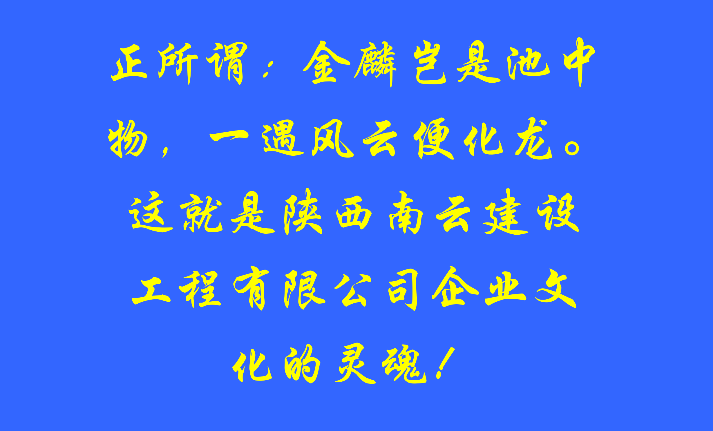正所謂:金麟豈是池中物,一遇風(fēng)云便化龍。這就是陜西南云建設(shè)工程有限公司企業(yè)文化的靈魂!