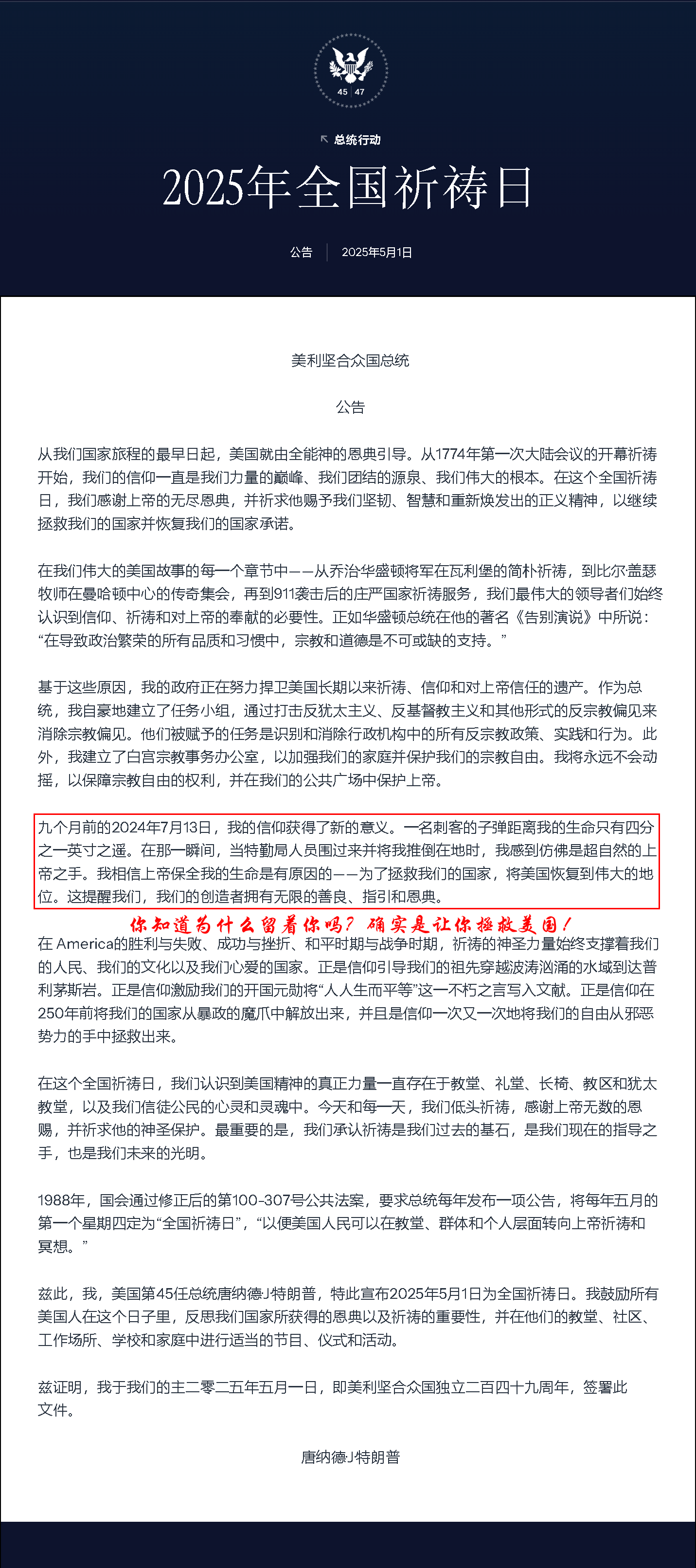 茲此,我,美國(guó)第45任總統(tǒng)唐納德·J·特朗普,特此宣布2025年5月1日為全國(guó)祈禱日。我鼓勵(lì)所有美國(guó)人在這個(gè)日子里,反思我們國(guó)家所獲得的恩典以及祈禱的重要性,并在他們的教堂、社區(qū)、工作場(chǎng)所、學(xué)校和家庭中進(jìn)行適當(dāng)?shù)墓?jié)目、儀式和活動(dòng)。